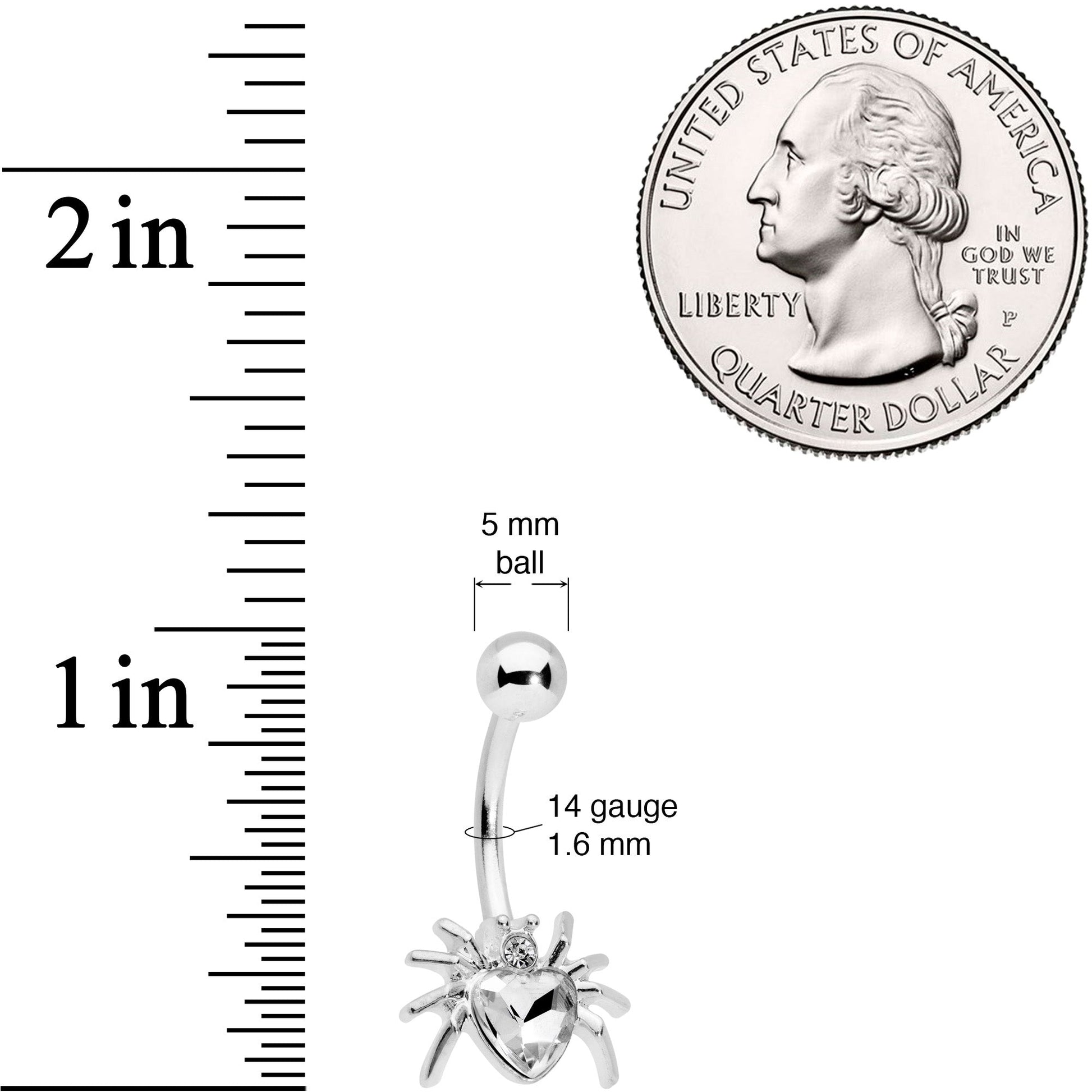 This spider body jewelry will give you the Halloween shivers.....but not shivers of fear! This 14 gauge navel ring is made with a 7/16" durable 316L surgical grade stainless steel curved barbell and has a 5mm top ball end. The bottom end is a spider charm with the body made of a Valentine's Day heart-shaped clear gem and the head composed of a smaller clear gem. So whether you cherish creepy crawlies or appreciate arachnids, this belly button ring is sure to snare you in its web!Specifications