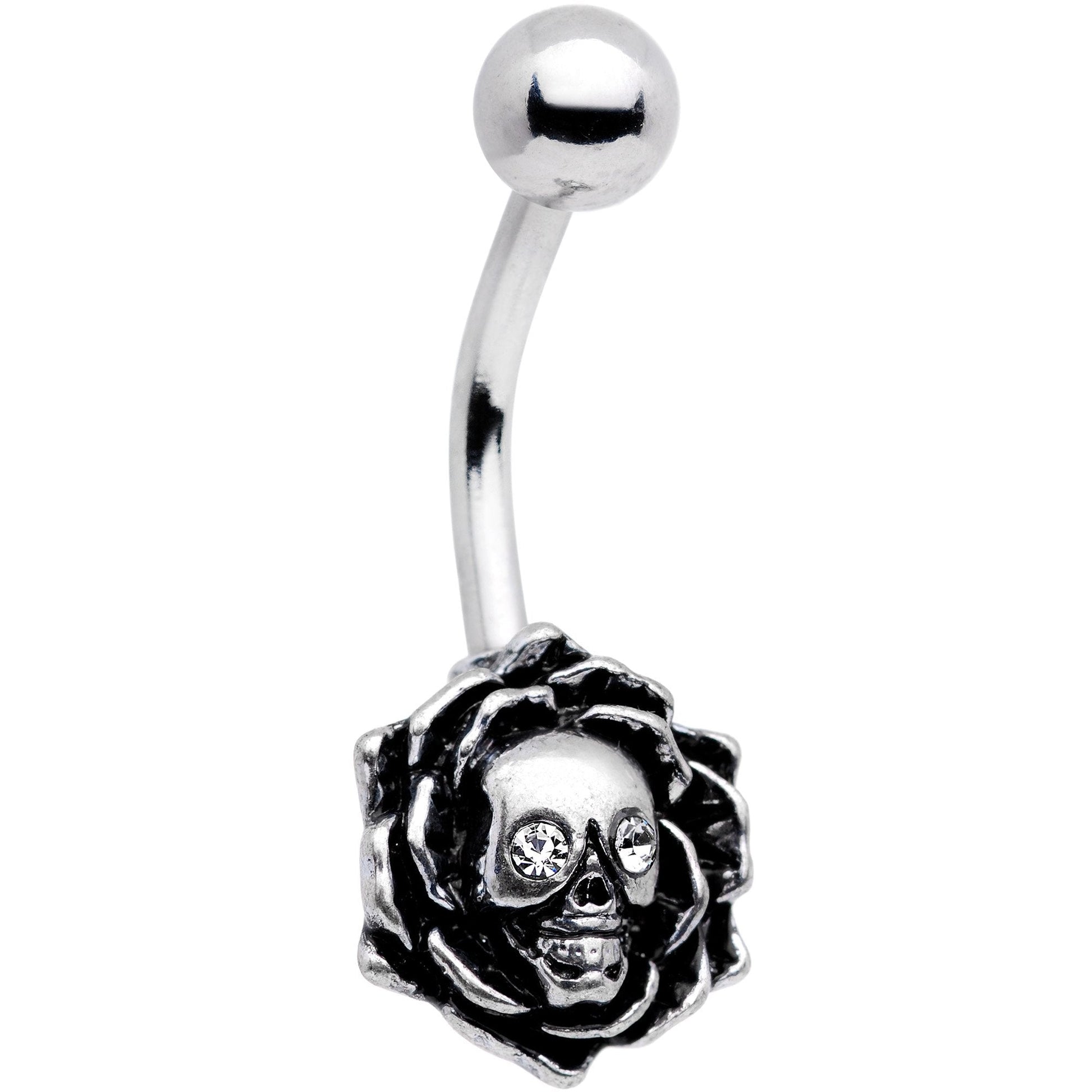 Clear Gem Halloween Skull Rose Flower Belly Ring