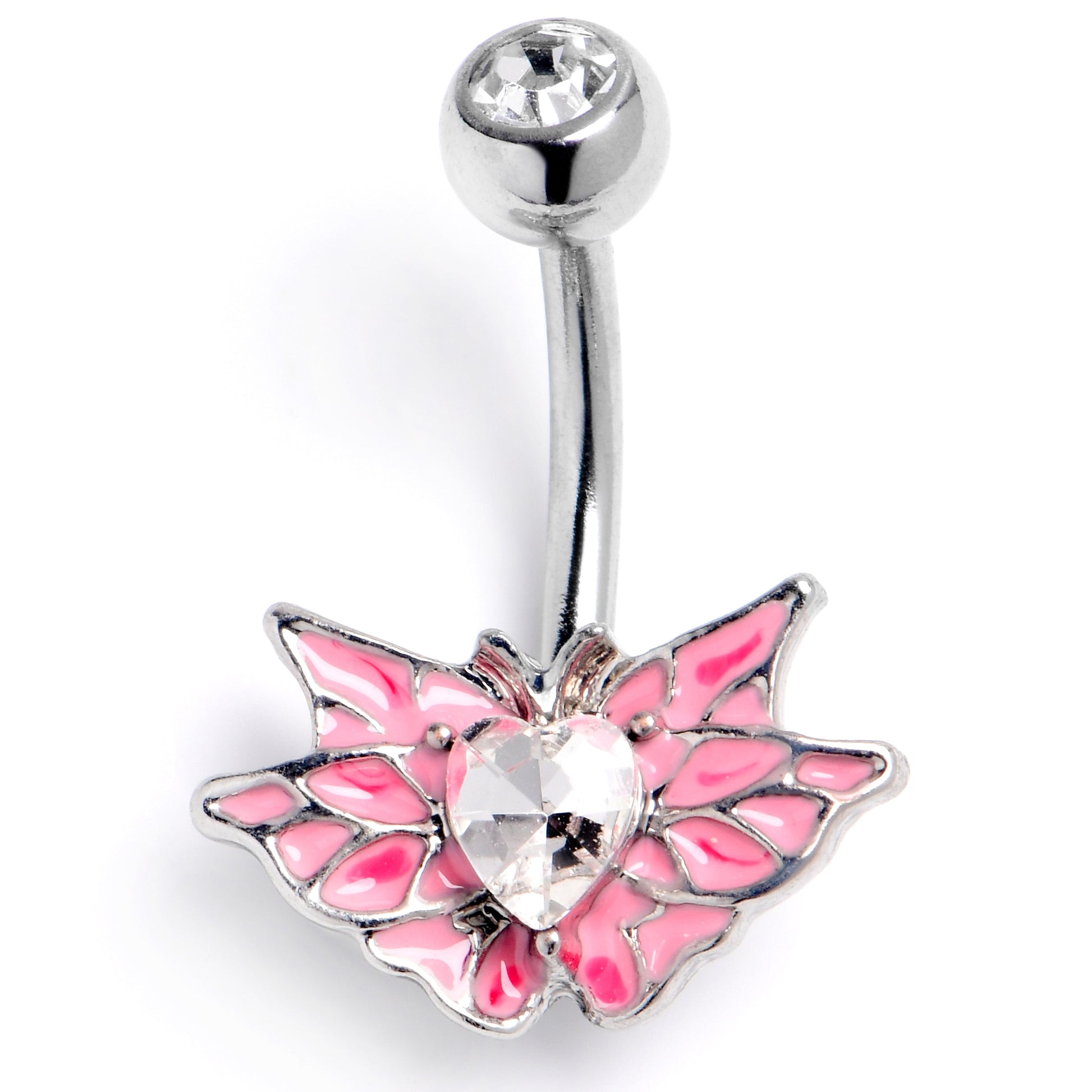 Give your look a charming flutter with this 14 gauge navel ring. It is made with a 3/8 inch 316L surgical grade stainless steel curved barbell with a 5mm top ball end which is set with a clear gem. The bottom ends features a gorgeous butterfly charm, with pink wings. The butterfly features a clear gem heart body for added style. You will totally heart the beautiful butterfly on this charming belly piercing ring.Specifications