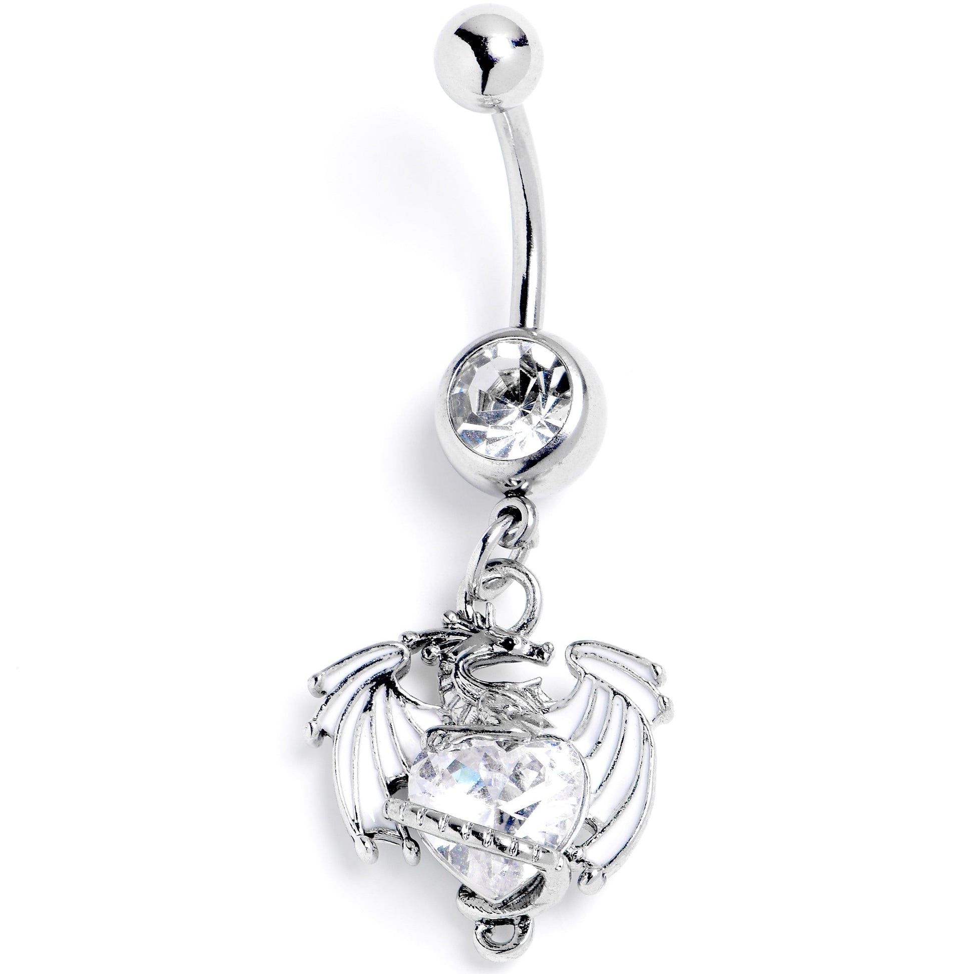 The dragon on this 14 gauge navel ring has a hoard of love to share. It is made with a 3/8 inch 316L surgical grade stainless steel curved barbell with a 5mm top ball end. The bottom ball end is 8mm and set with a clear gem. Dangling beneath is a dragon charm with white embellished wings. The dragon is clutching a clear gem heart for added style. You will definitely want to share this dragons love with this medieval style belly piercing jewelry.Specifications