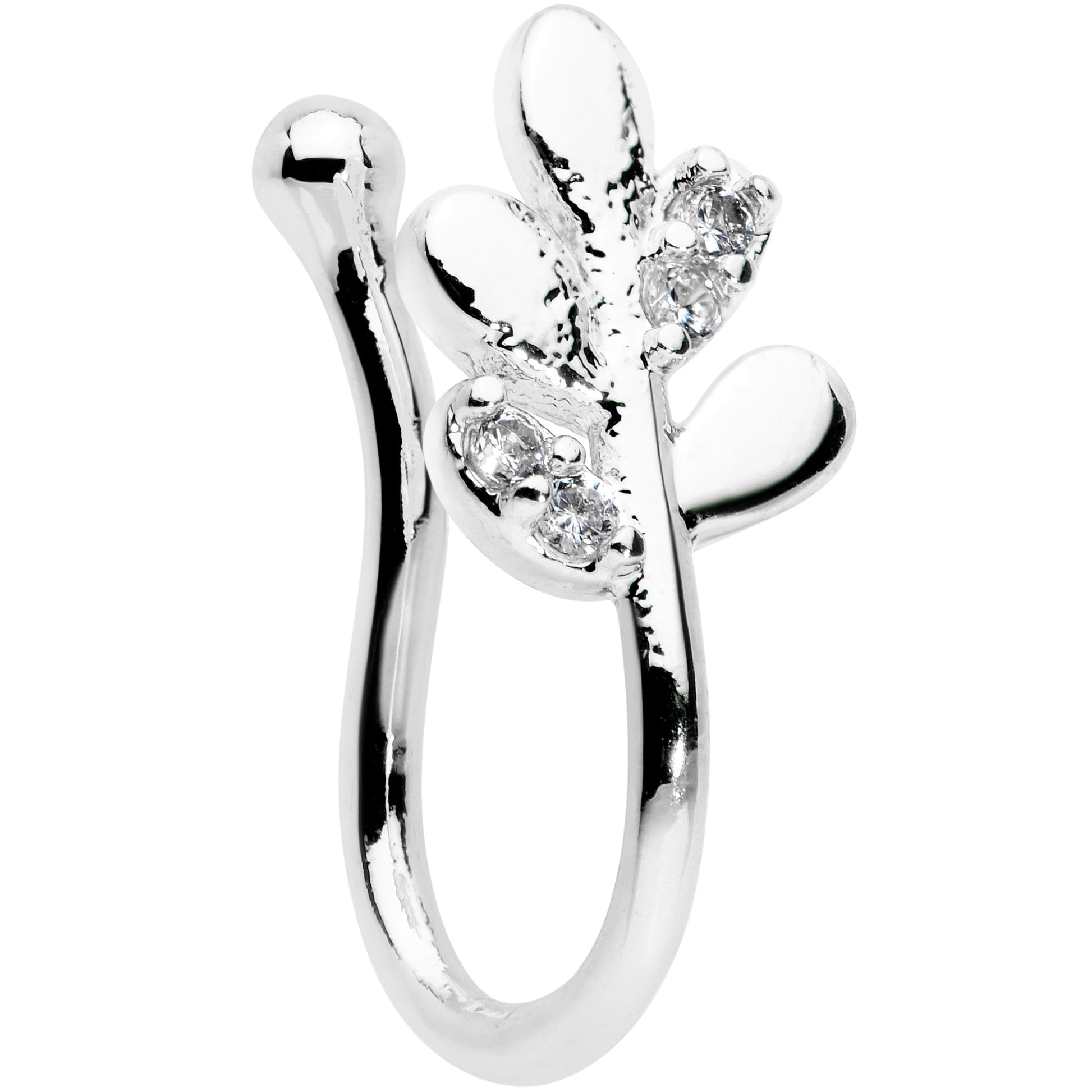 Love them and leave them...or leave it in! With this clip on nostril jewelry, there's no need to commit to a piercing! It's made with brass. The end features a leaves charm, embellished with clear gems for an added touch of style. It's adjustable to get the ideal fit for your nose. One size fits most! You'll love these leaves so much, you'll never want to let them leave your nose!Specifications