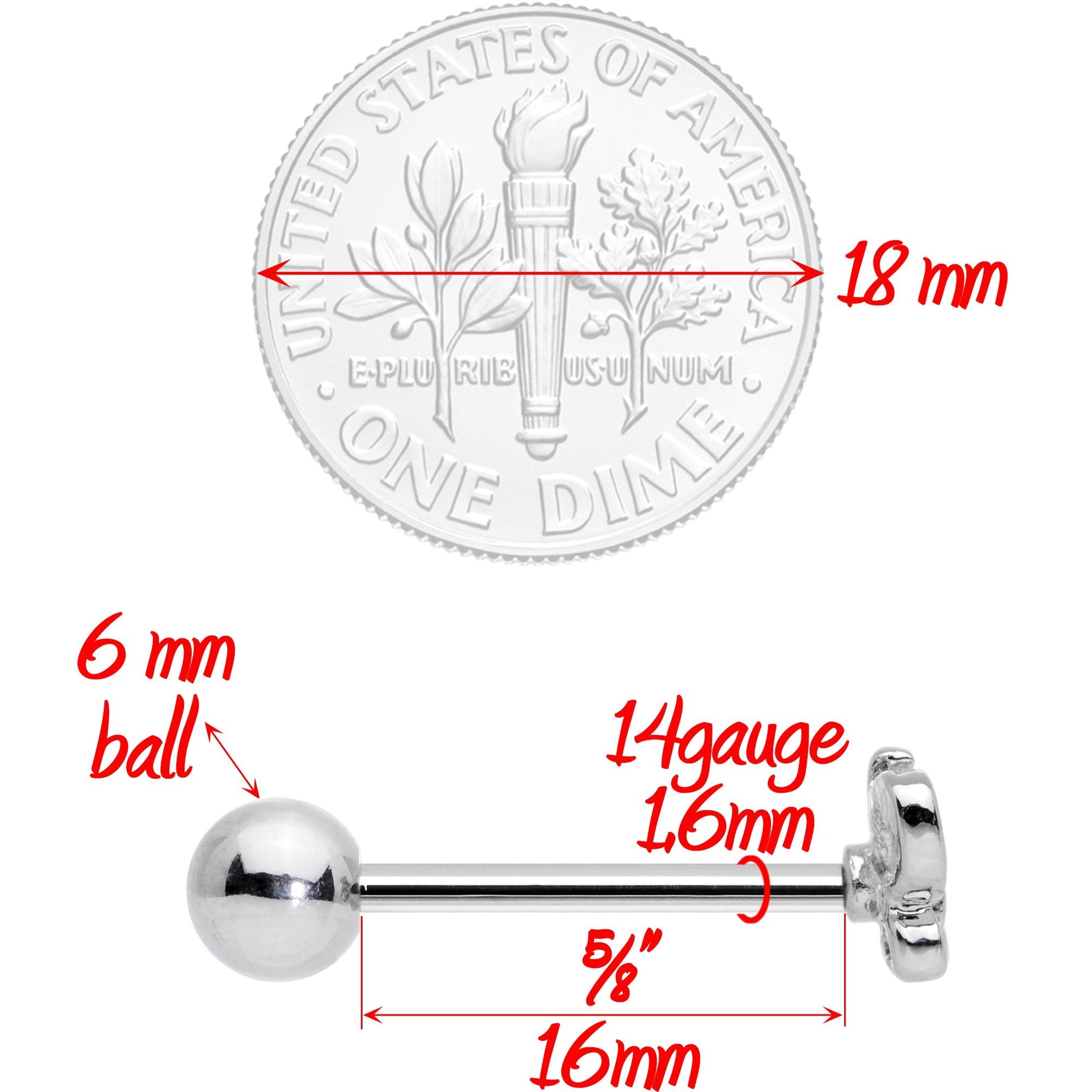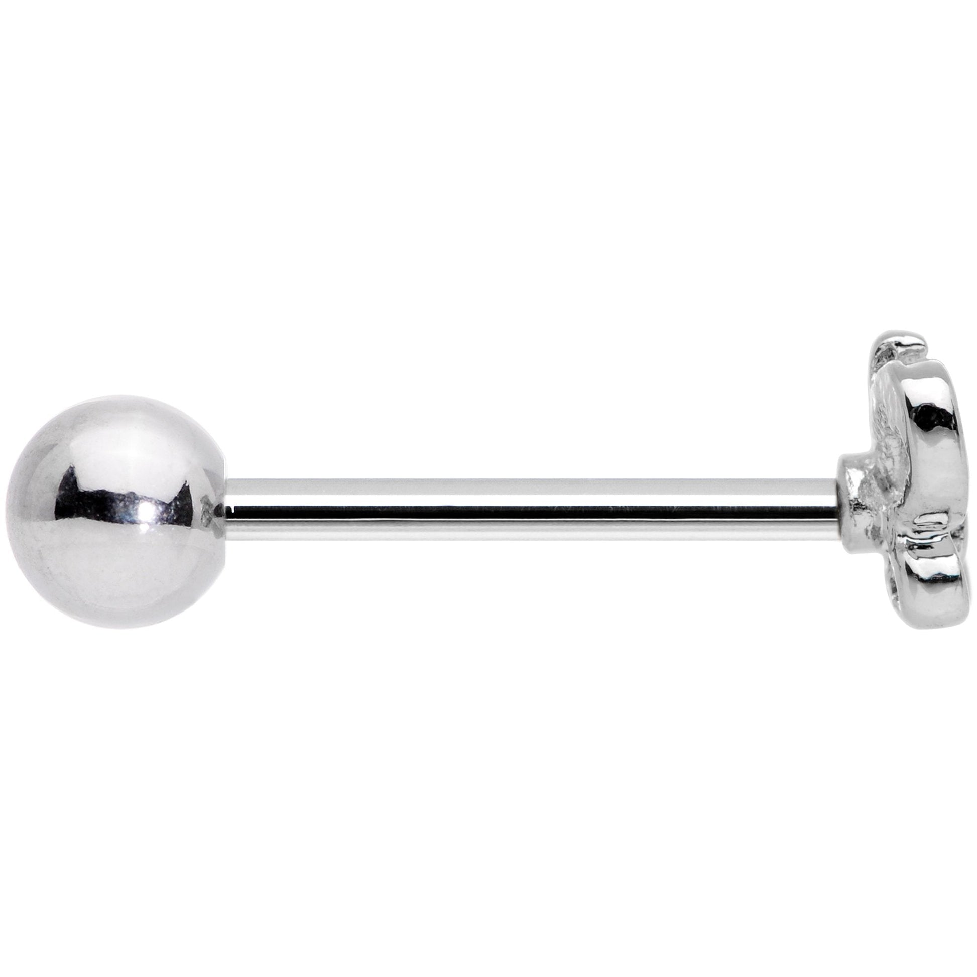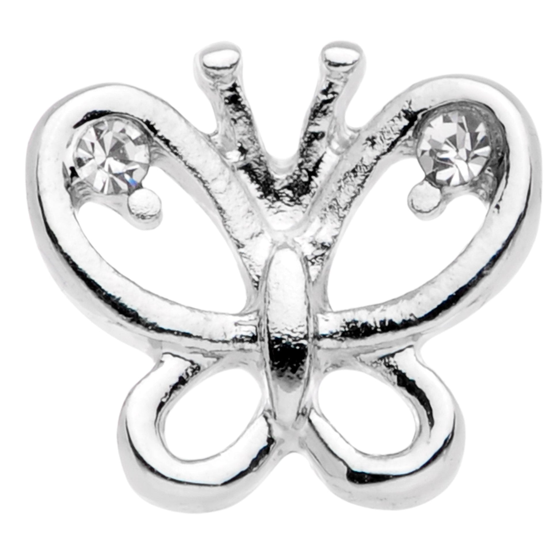 This butterfly is feeling a little bit loopy with it's exaggerated rounded wings! The 14 gauge tongue jewelry is made with a 5/8" durable 316L surgical grade stainless steel straight barbell and has a 5mm bottom ball end. The top end is a butterfly with round wings for an airy feel. The inner top corners of its wings are embellished with small clear gems, adding a further touch of style that keeps simple from looking plain. Spread your wings and fly with this beautiful butterfly tongue barbell!Specifications