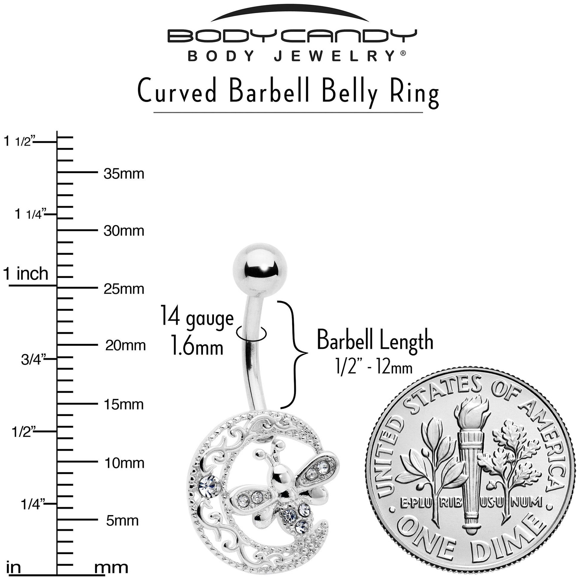 This crescent moon may be alone in the sky but it's got a friend on this 14 gauge navel ring. It is made with a 3/8 inch 316L surgical grade stainless steel curved barbell and has a 5mm top ball end. The bottom end features a crescent moon charm, embellished with filigree detailing giving it an airy appearance as well as a clear gem embellishment. Set between the points of the moon is a dragonfly charm, with clear gems in the wings and body. You'll want this belly piercing jewelry to keep you company forever.Specifications