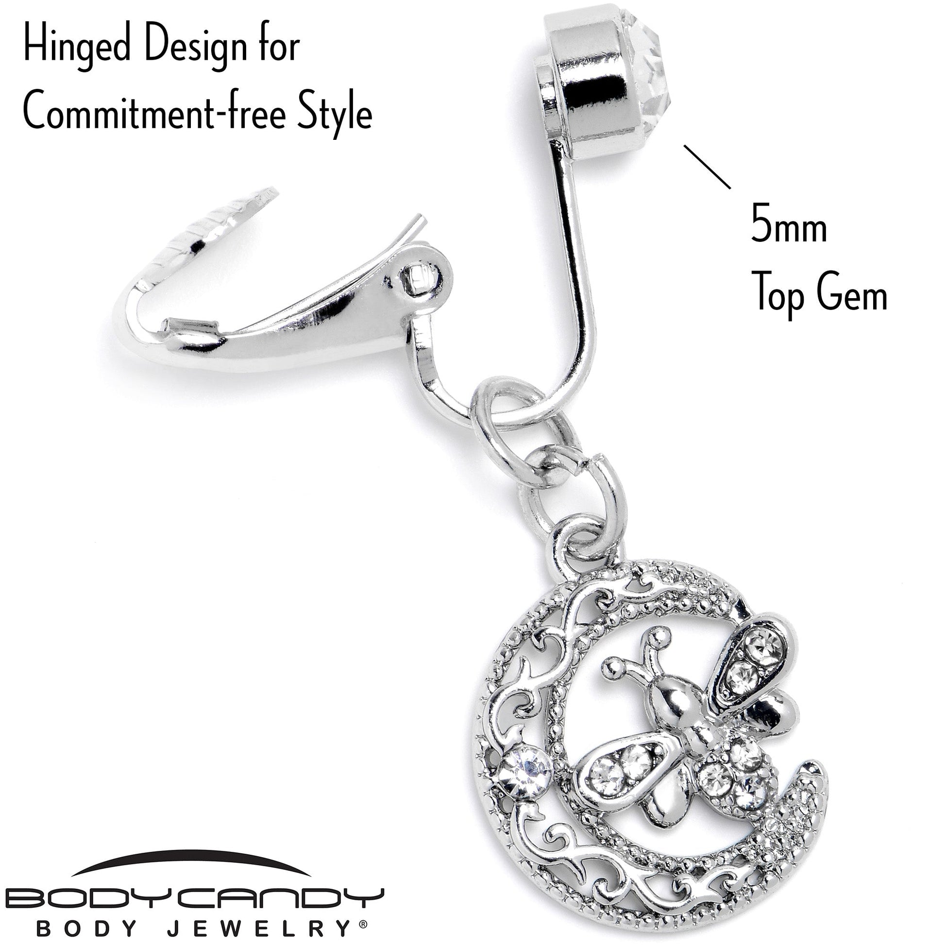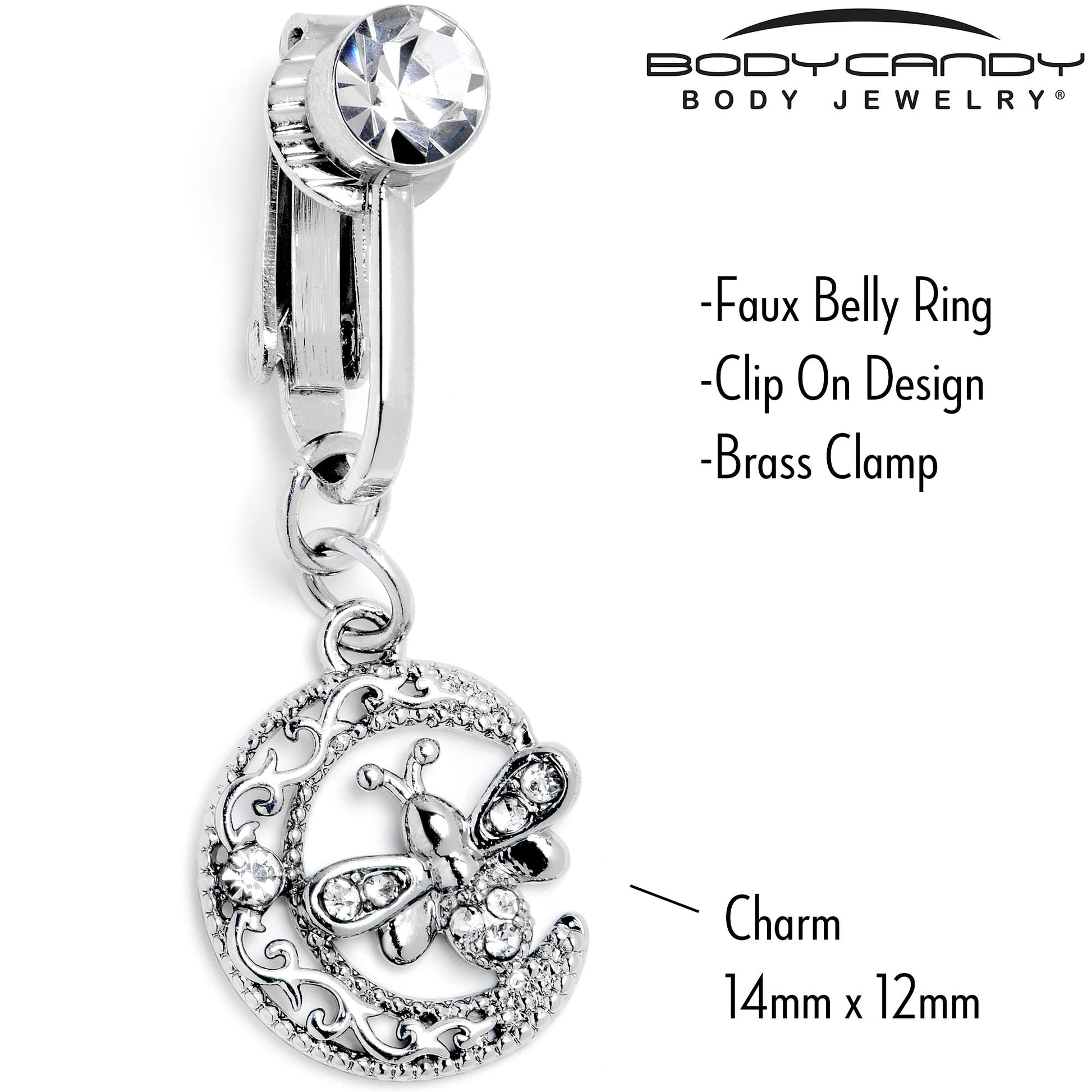 If you like the look but aren't ready to commit yet, this faux navel ring is perfect for you! It is made with brass and features a clip on design to hold it securely in place without the need of a trip to the piercer. It features a dangle crescent moon charm, with one side featuring filigree detail and a clear gem while the other side features a dragonfly set with matching clear gems. Try out a new look before you commit with this fake belly piercing jewelry.Specifications