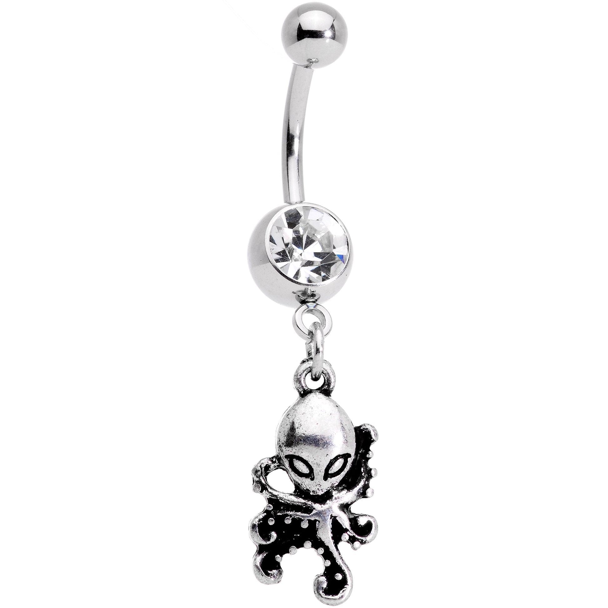 You'll have to be careful not to let anyone get too wound up when you wear this 14 gauge octopus navel jewelry. Made with a 3/8ƒ?? durable 316L surgical grade stainless steel curved barbell, this belly button ring features a clear bottom gem and a dangle octopus bottom charm.Specifications
