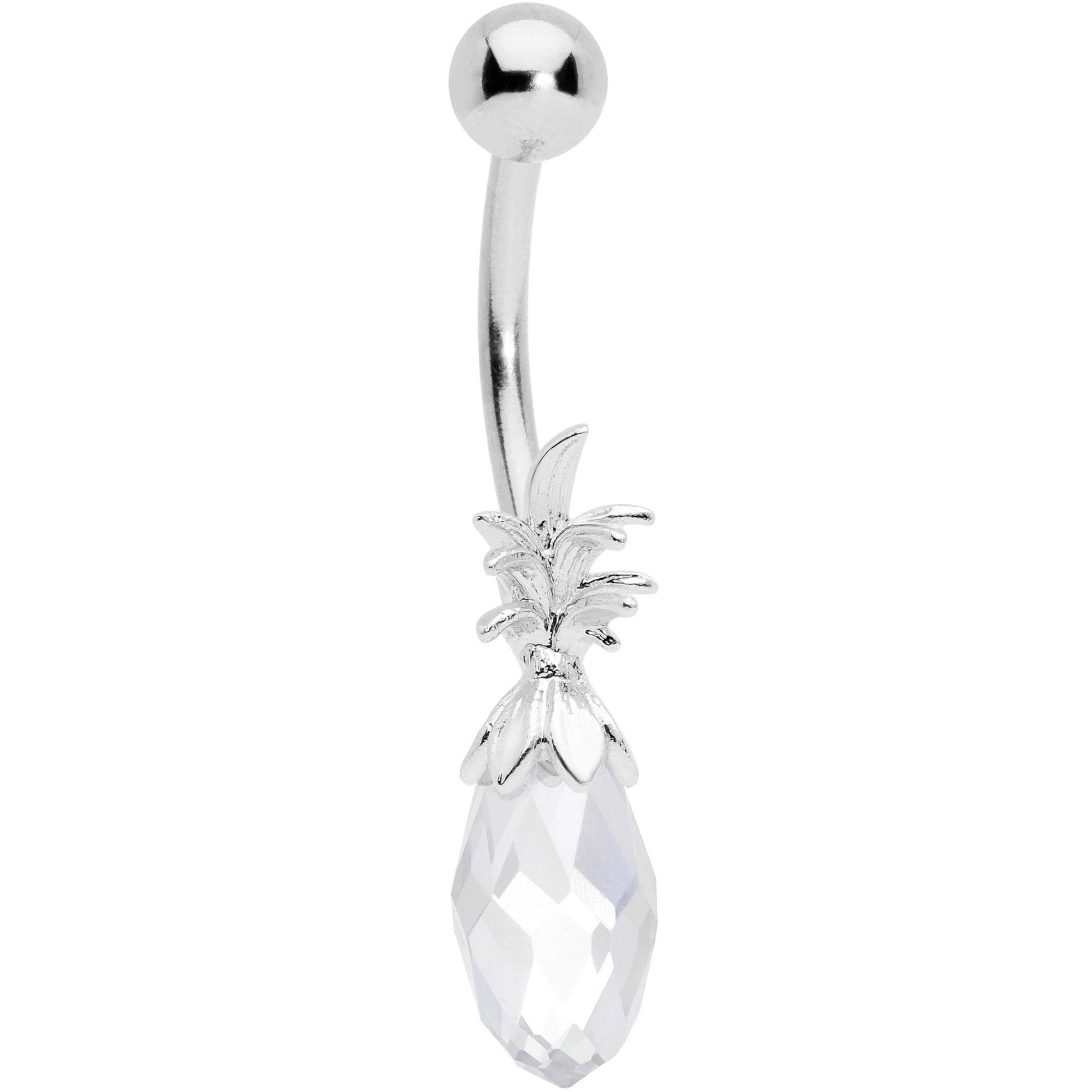 This set of 14 gauge navel rings has something to suit your every mood or style. They are all made with 7/16" durable 316L surgical grade stainless steel curved barbells. The first has clear gems set into its 5mm top ball end and 8mm bottom ball end. The second one has a large clear gem set into its base for a look of traditional glamour. The third is elegantly simple, taking its visual impact from the contrast between its 5mm top ball end and 8mm bottom ball end. And the final one features a bottom end that looks like a pineapple, with leaves and the body of the fruit made of a faceted clear gem that cunningly replicates the texture of the real thing! Whether you're simply styled or want to be transported to a tropical climate, this set of belly button rings has everything you need. Sold as a set of four.Specifications