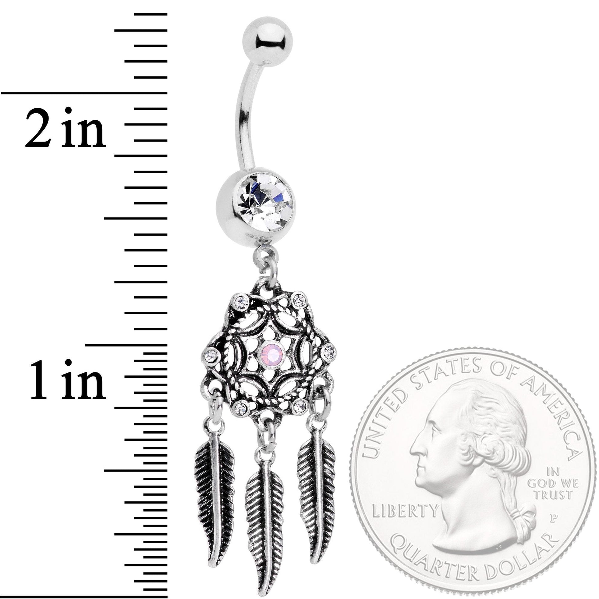 This 14 gauge belly button ring has so many tiny details that it may take a second look to fully appreciate its beauty. It's made with a 3/8" durable 316L surgical grade stainless steel curved barbell and has a 5mm top ball end. The bottom ball end is 8mm and set with a large clear gem. Dangling from that is a coiled circle, surrounded on the outside with a series of round triangles that each have a small clear gem set at their apex. Within the circle is a six-pointed star with a pink faux opal at the center, giving it a visual anchor that keeps it from being overwhelming. From the base there hangs three small feathers, each engraved and burnished for realistic texture detail. Whether you're looking to push your belly jewelry to the next level or have a complex personality, this navel ring will keep you looking...and everyone else too!Specifications