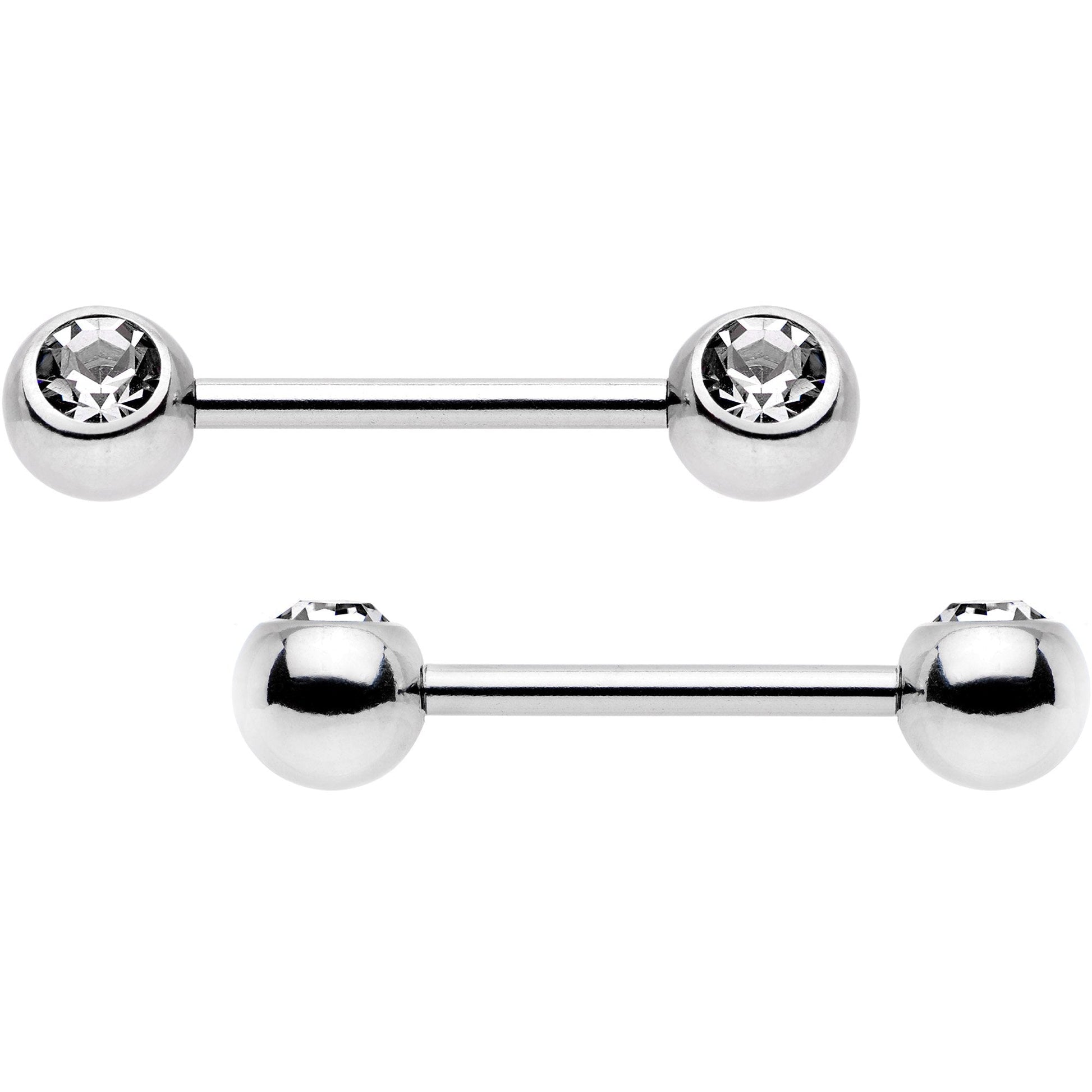 If you love variety, then this fun 14 gauge nipple barbell set is for you! This set comes with four barbell nipple rings including two rainbow PVD over 316L surgical grade stainless steel straight barbells and two durable 316L surgical grade stainless steel straight barbells. Each barbell features an inlaid clear gem ball end and is 9/16" in length. Sold as a set of 4 nipple barbells!