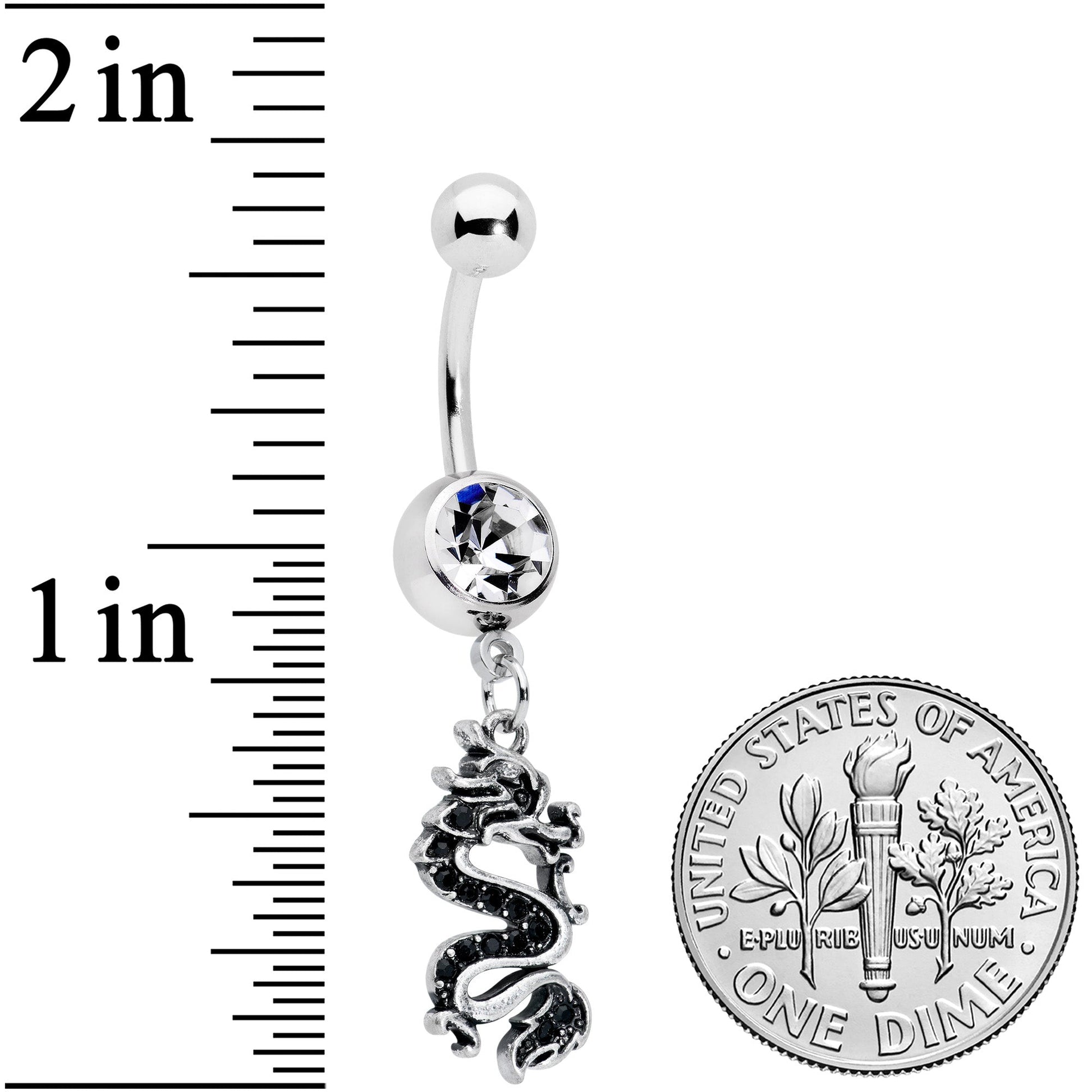 Get ready to roar when you're rocking this 14 gauge navel jewelry! It's made with a 3/8" durable 316L surgical grade stainless steel curved barbell with a 5mm top ball end. The bottom ball end is 8mm and set with a large clear gem. Dangling beneath is a medieval dragon charm, with fine detailing. It's heavily burnished to make those details pop and features textured embellishment for a look that can't help but get noticed. If you're dreaming of castles and days of yore, this dragon is sure to give your look a renaissance!Specifications