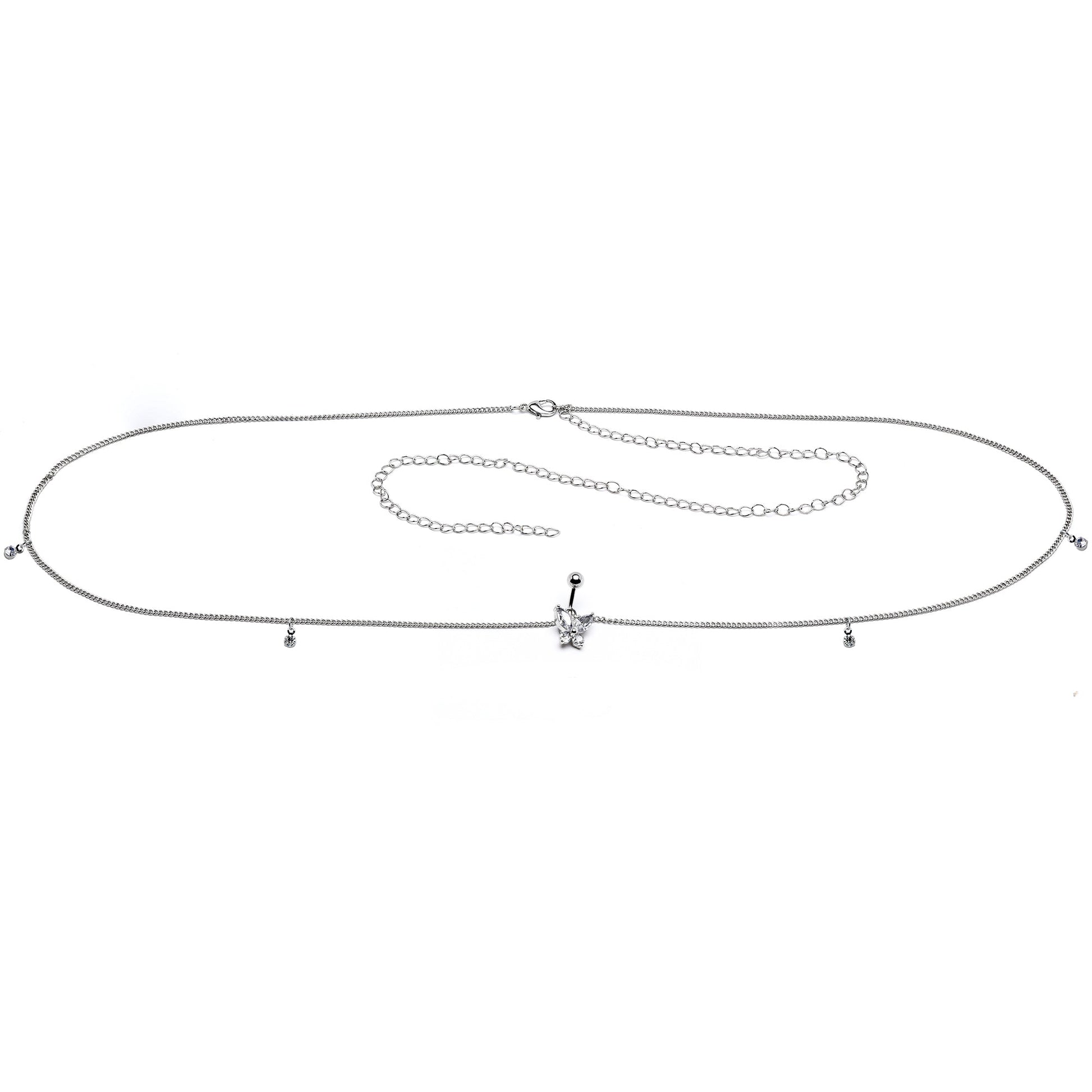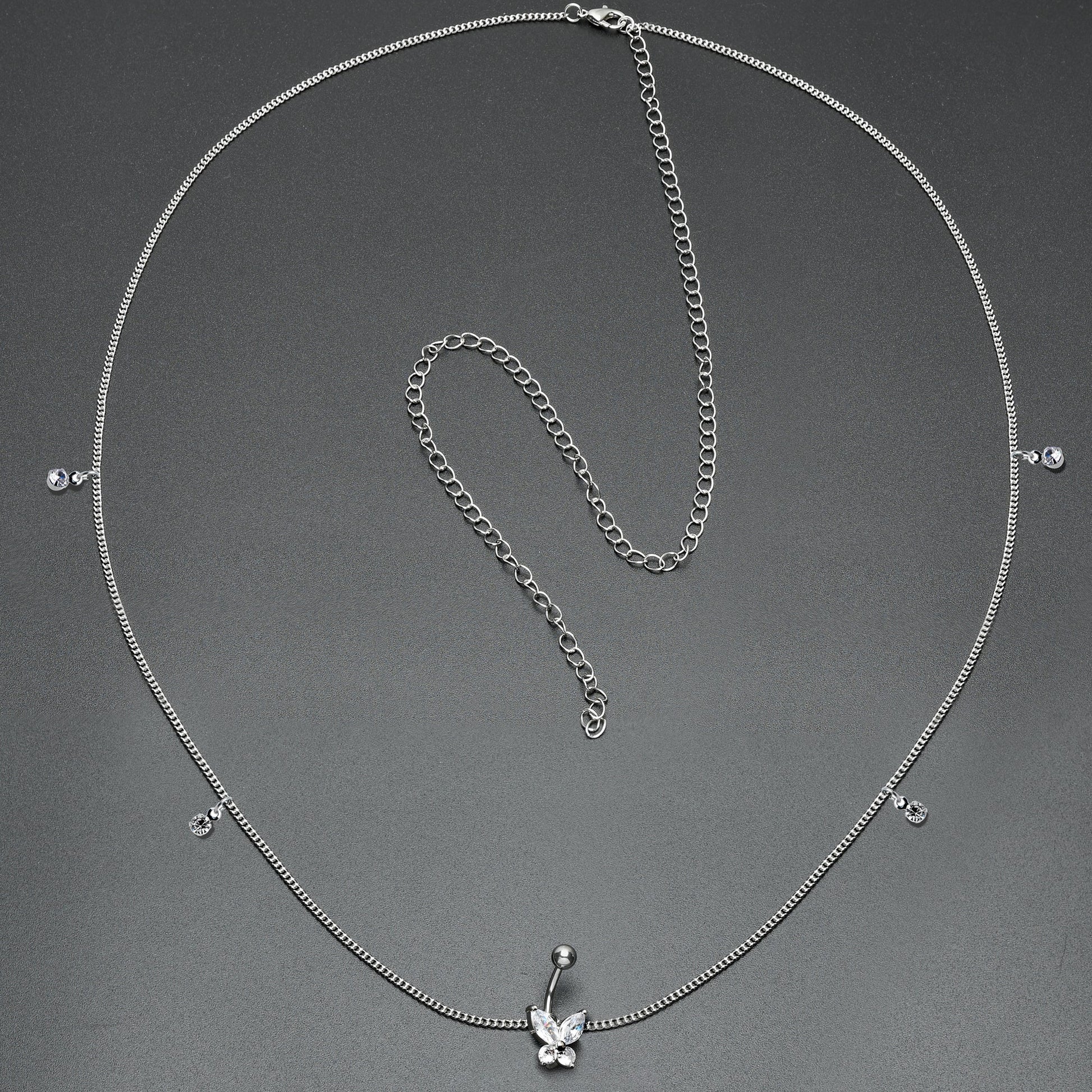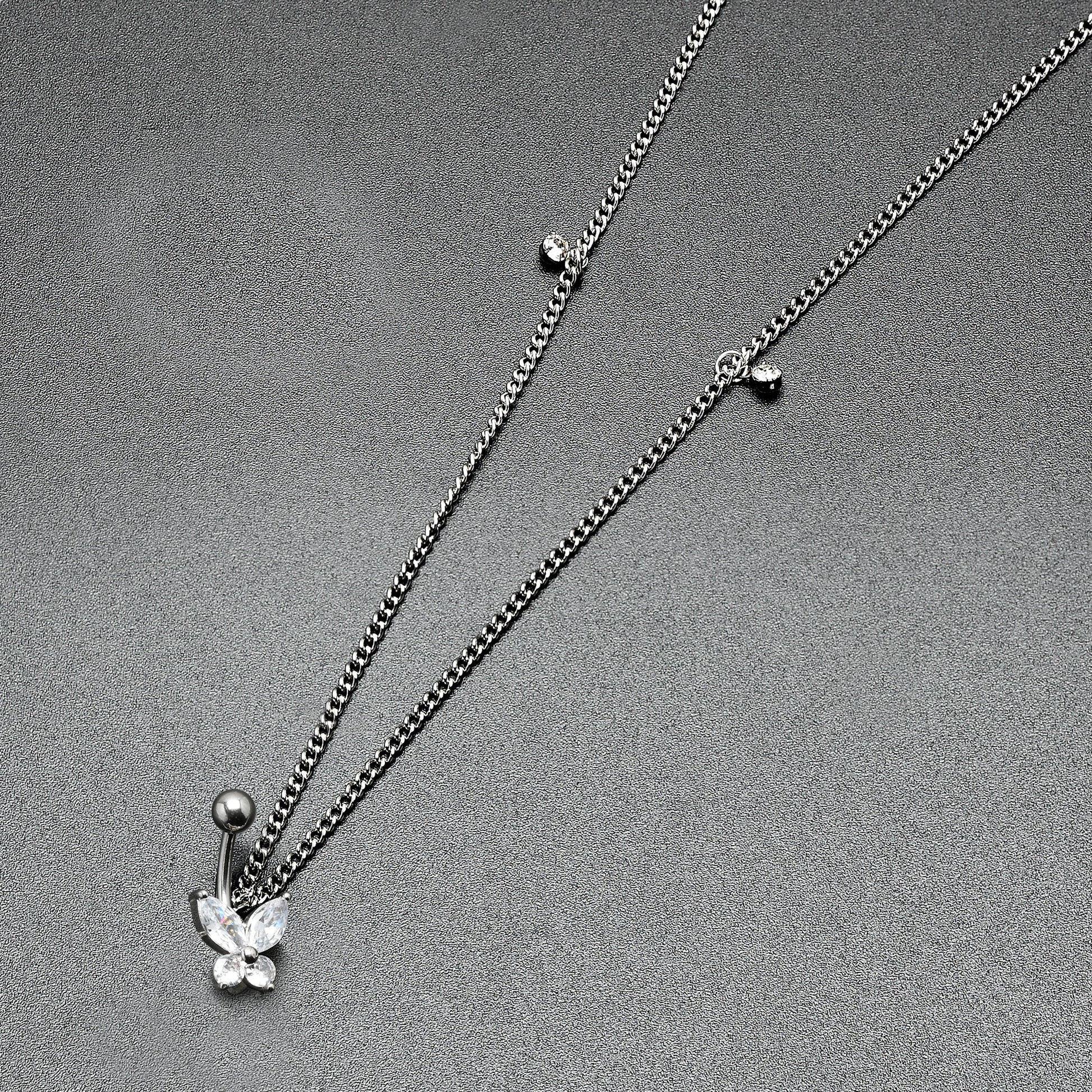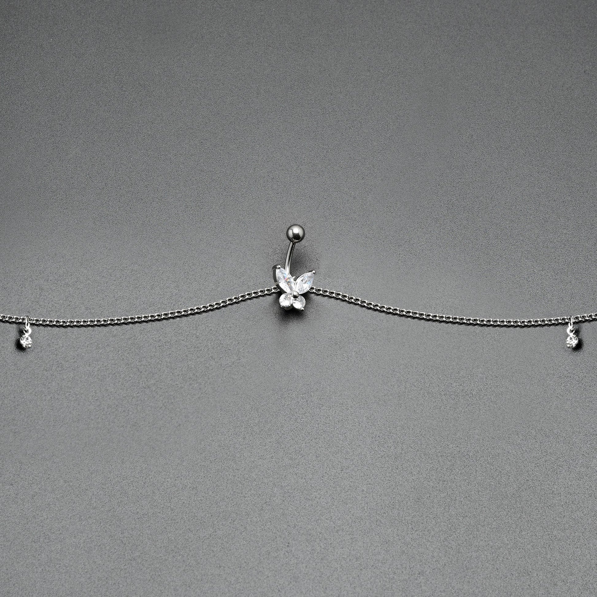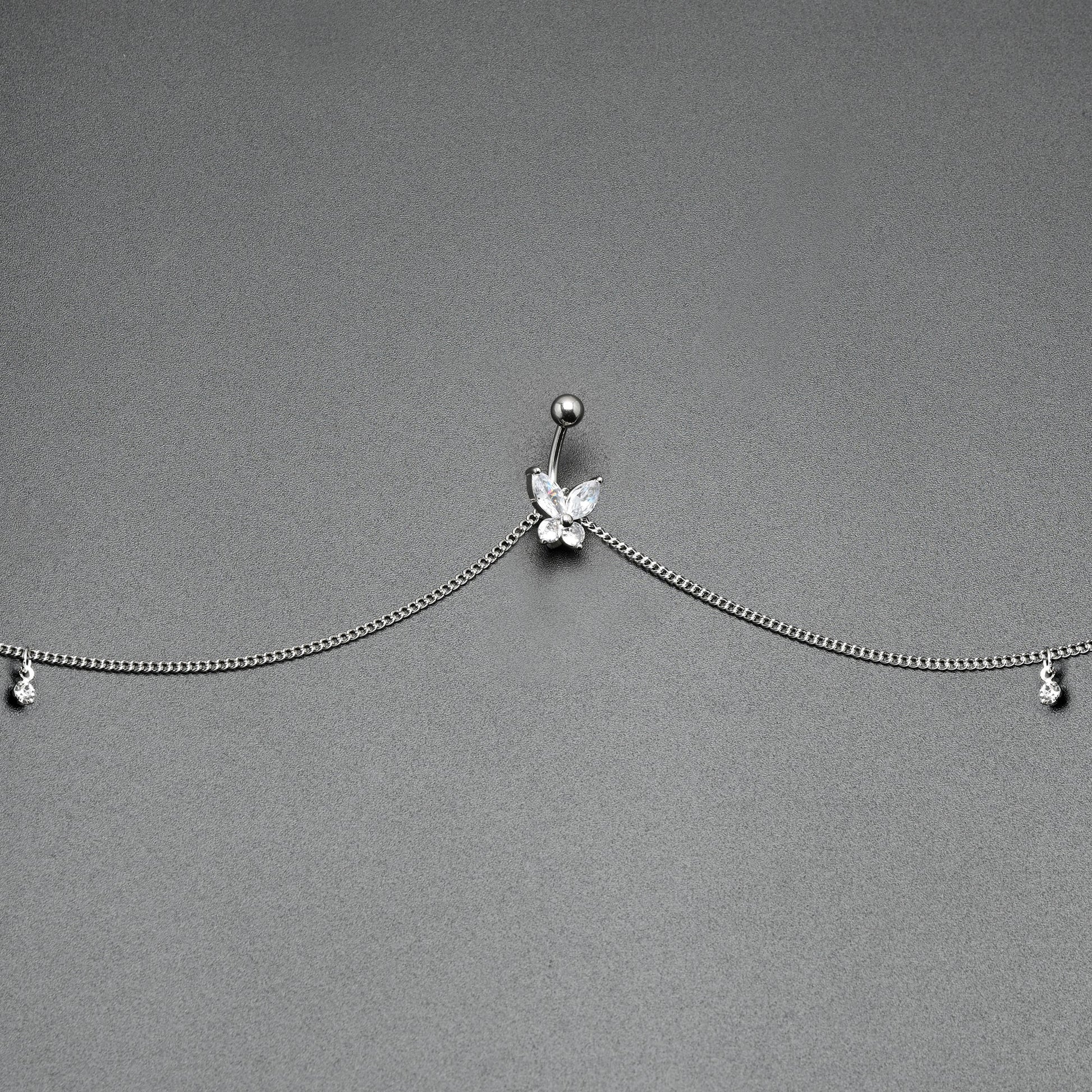 Don't let your midriff go bare when you wear your favorite halter top or belly shirt. This sexy belly chain jewelry is attached to a 14 gauge navel ring made with a 3/8" durable 316L surgical grade stainless steel curved barbell with a 5mm top ball end. The bottom end features a butterfly charm, composed of clear gems. This belly piercing jewelry features a 29.5"-44" chain length waist belt as well as clear gem dangle charms. The waist chain features a lobster clasp used to adjust the length to fit your body.Specifications