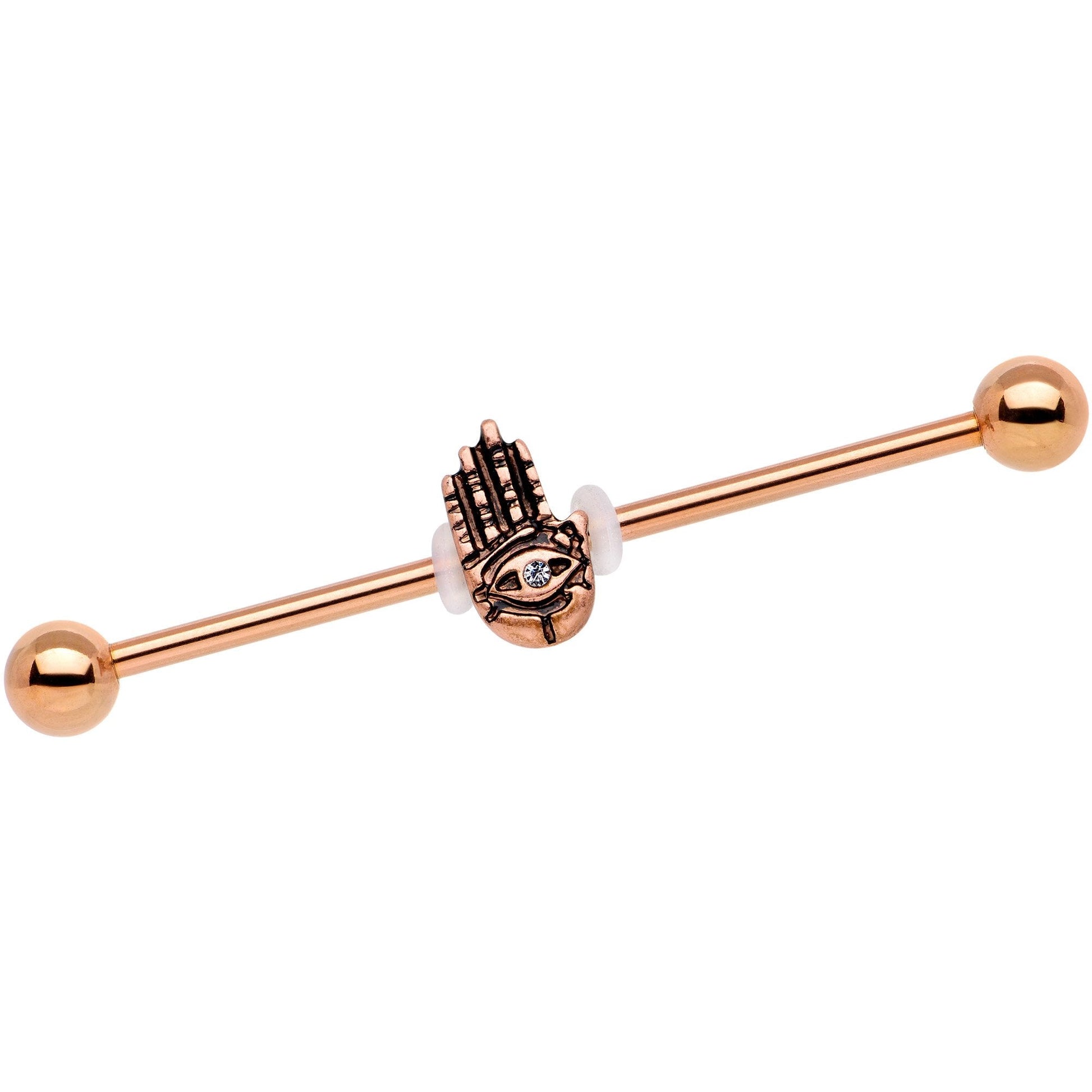 Clear Gem Rose Gold Tone Hamsa Eye Industrial Barbell 38mm