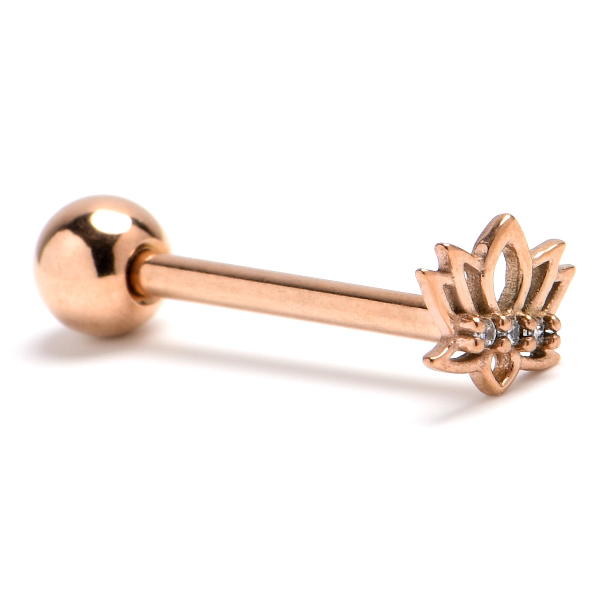 Get loaded up on lotus flower style when you wear this fun 14 gauge tongue jewelry. It is made with a 5/8 inch rose gold tone PVD over 316L surgical grade stainless steel straight barbell with a 6mm bottom ball end. The top end features an openwork lotus flower charm, set with clear gem embellishment. Speak your peace with this luscious lotus tongue piercing ring.Specifications