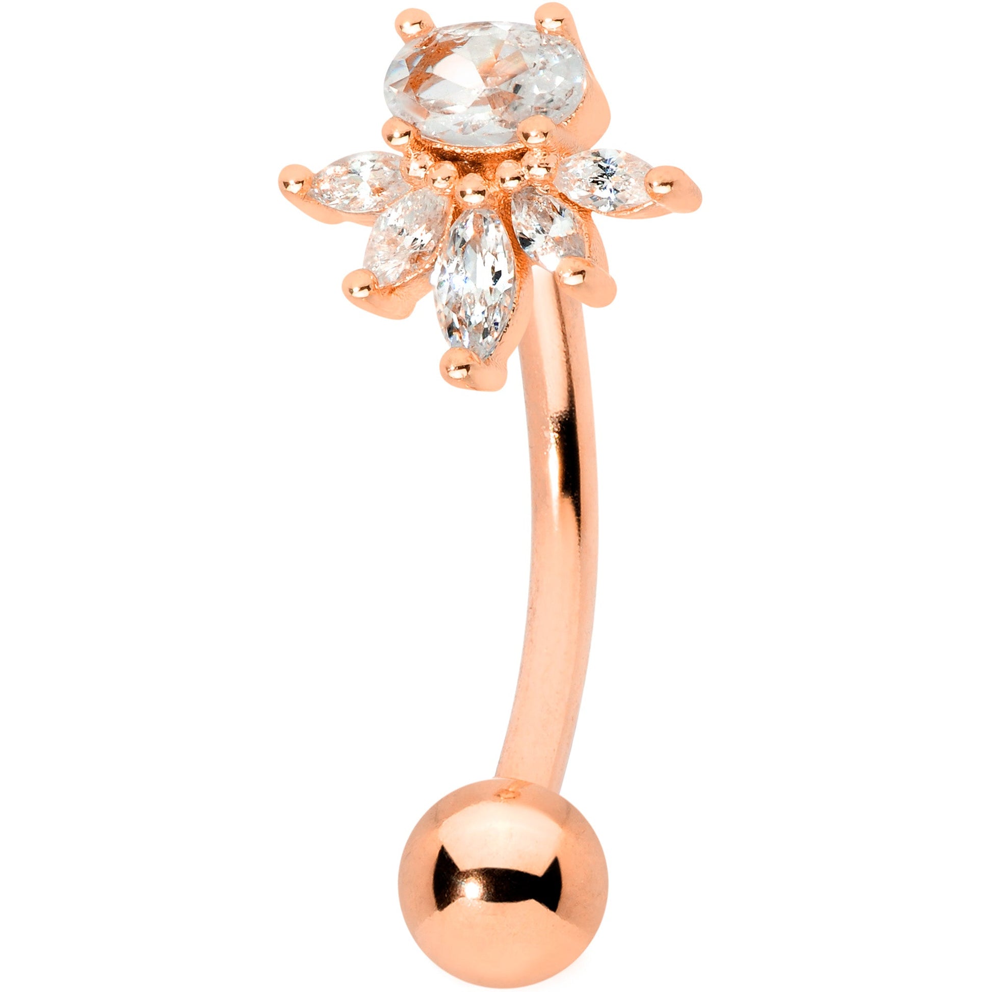 Combine elegance and opulence with this 14 gauge navel jewelry! It's made with a 7/16" rose gold tone anodized over 316L surgical grade stainless steel curved barbell with a 5mm ball end. The other end features a clear central oval gem. Beneath that is a spray of matching clear oval-shaped gems, angling out in a fan shape. Get into the spray this summer with this gorgeously glam belly piercing jewelry!Specifications