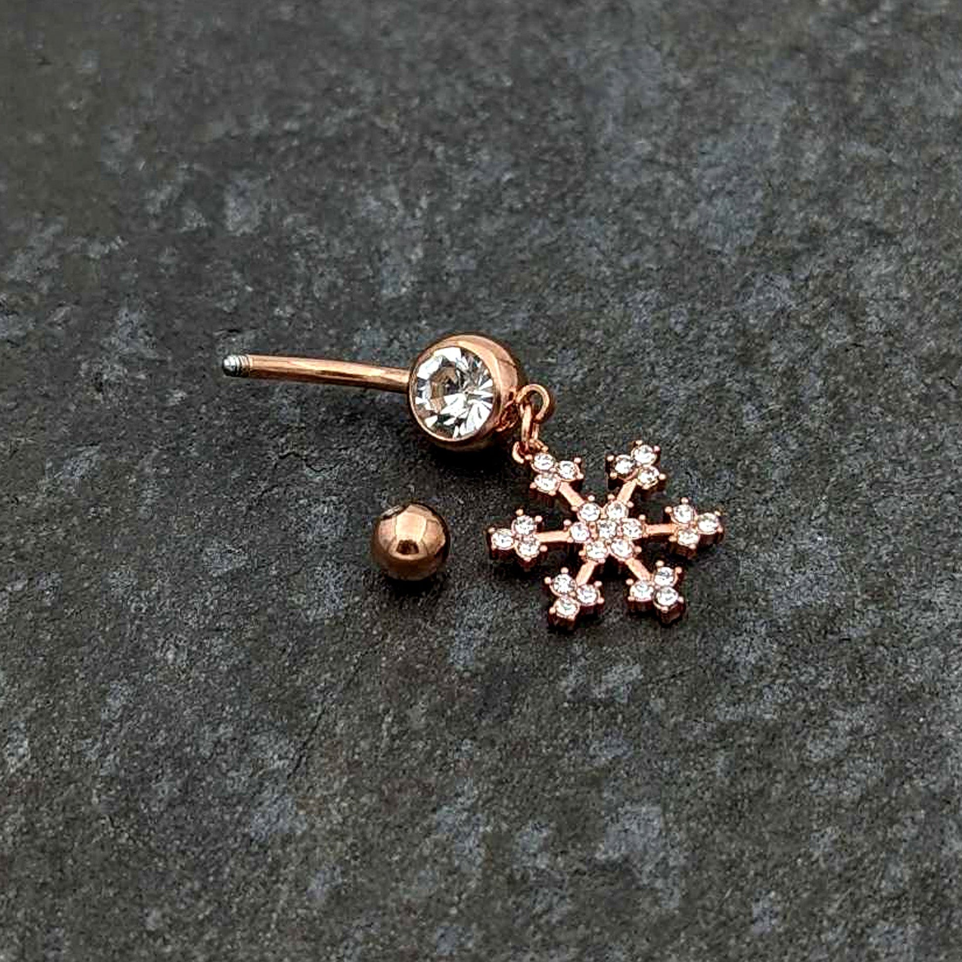 The snowflake on this 14 gauge navel ring won't melt, but it just might melt your heart! It's made with a 3/8" rose gold tone PVD over 316L surgical grade stainless steel curved barbell with a 5mm top ball end. The bottom ball end is 8mm and set with a large clear gem. Dangling beneath it is a snowflake charm. Each of the points is set with a trio of clear gems, with a matching circle of clear gems at the center for an added element of style. How could you leave this elegant belly piercing ring out in the cold?Specifications