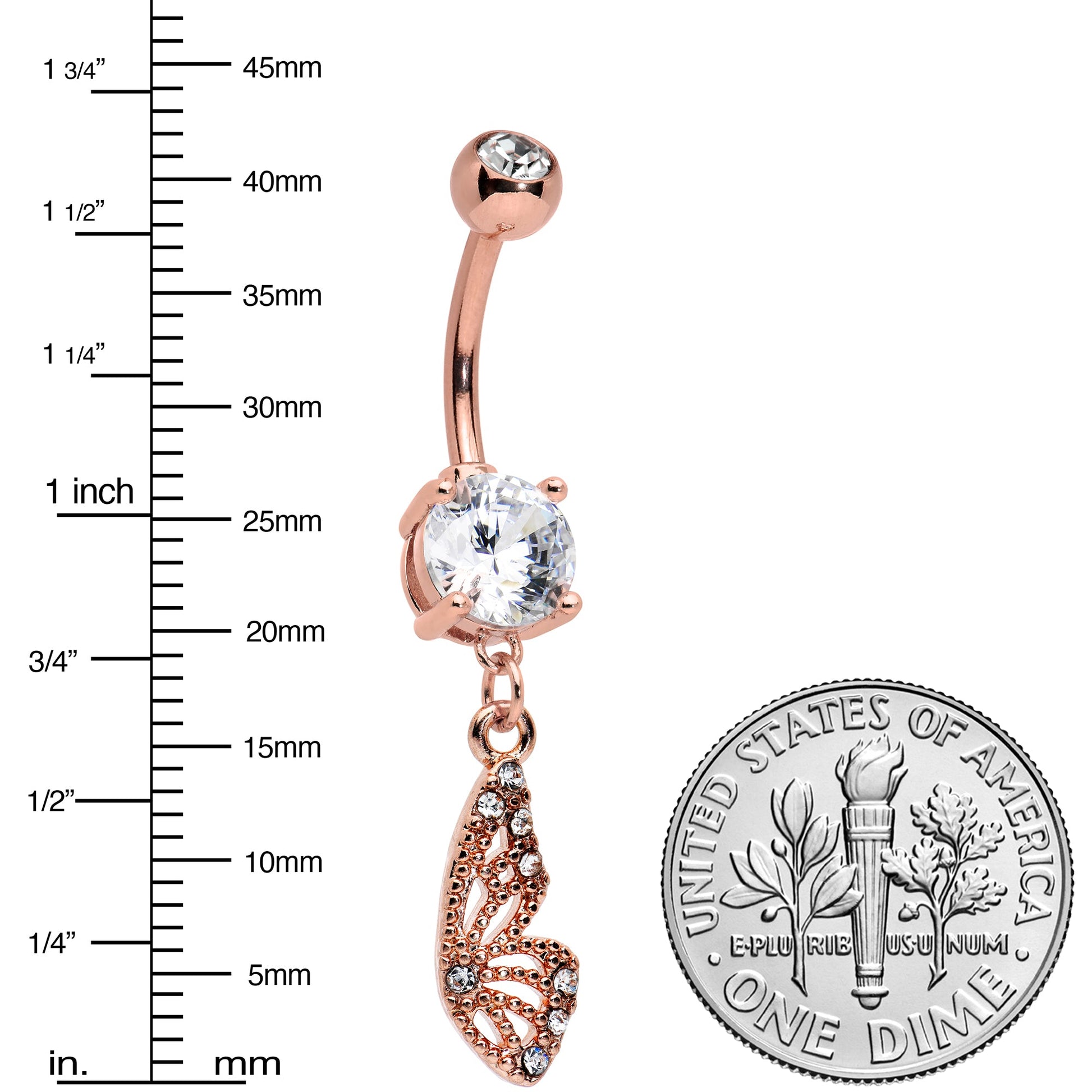 Spread your wings with this 14 gauge navel ring! It's made with a 3/8" rose gold tone plated over 316L surgical grade stainless steel curved barbell. The top ball end is 5mm and set with a clear gem. The bottom end features a matching clear gem for a cohesive appearance. Dangling beneath it is a wing charm, with intricate detailing and with an openwork design. It's further embellished with clear gems and textured detailing for a truly eye-catching look. Let your belly piercing soar with this elegantly styled navel piercing ring!Specifications