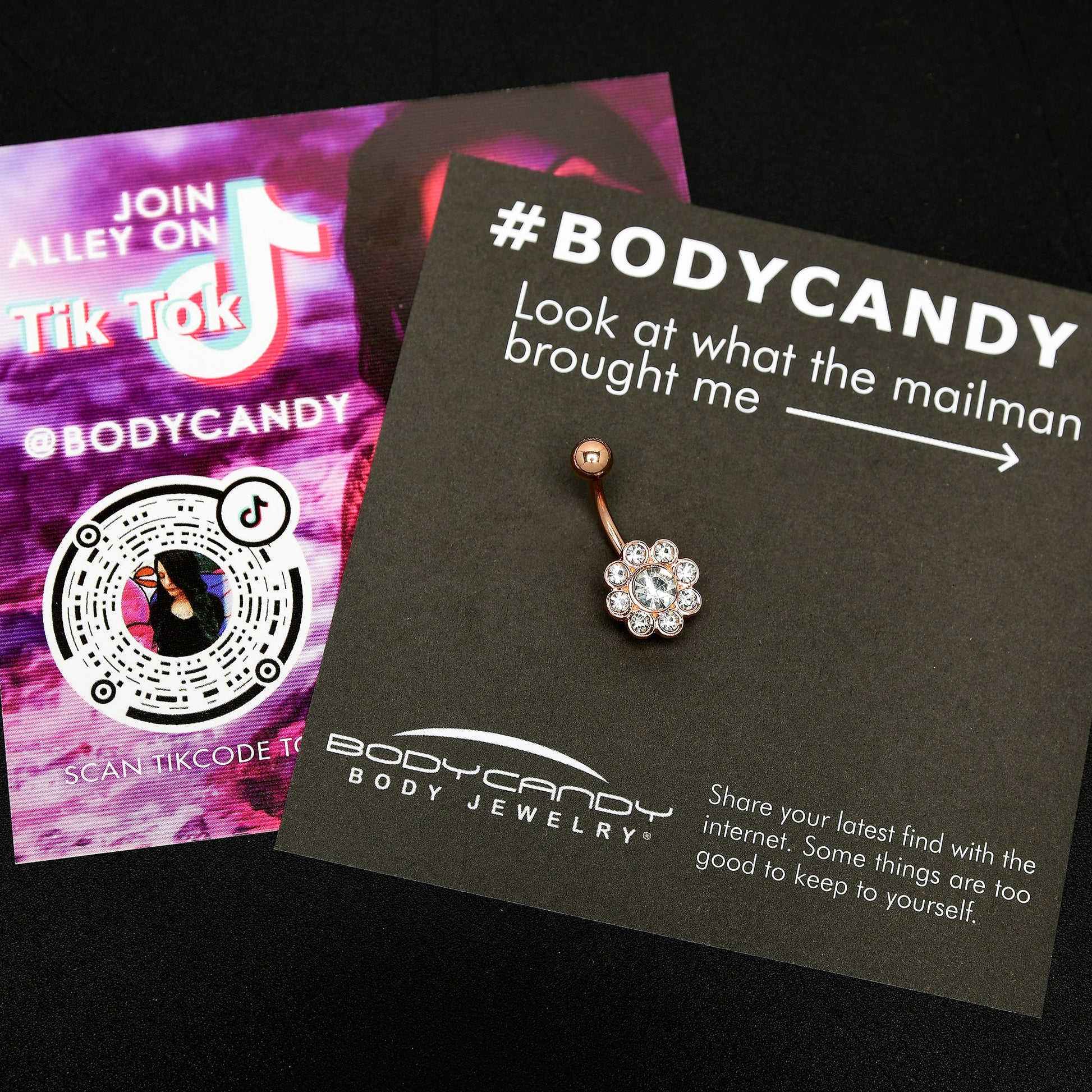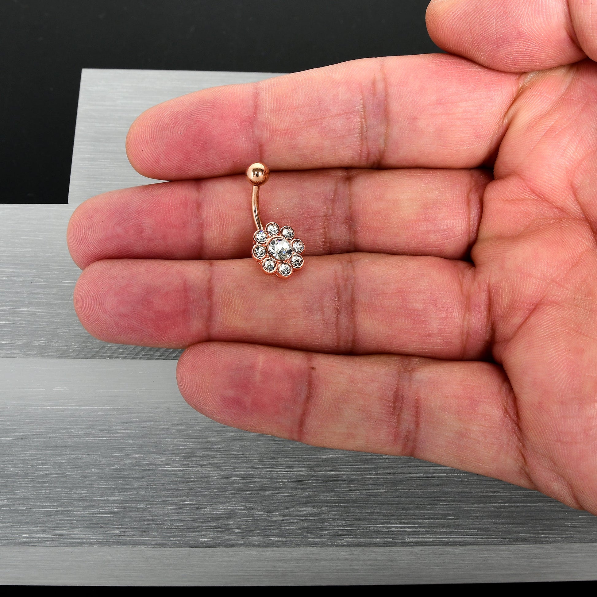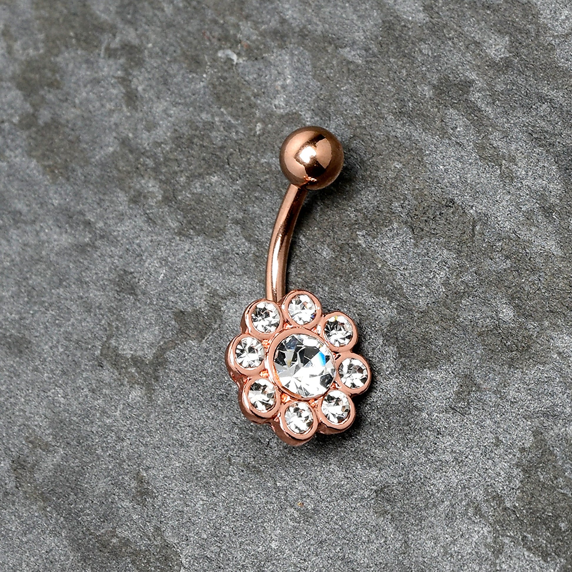 Add some floral whimsy to your look with this 14 gauge navel ring! It's made with a 3/8" rose gold tone electroplated over 316L surgical grade stainless steel curved barbell with a 5mm top ball end. The bottom end features a cheery flower charm, with the center and petals all composed of individual clear gems. The overall look is charmingly upbeat. You'll bring a smile to everyone's face when you're rocking this endearing floral belly piercing ring!Specifications