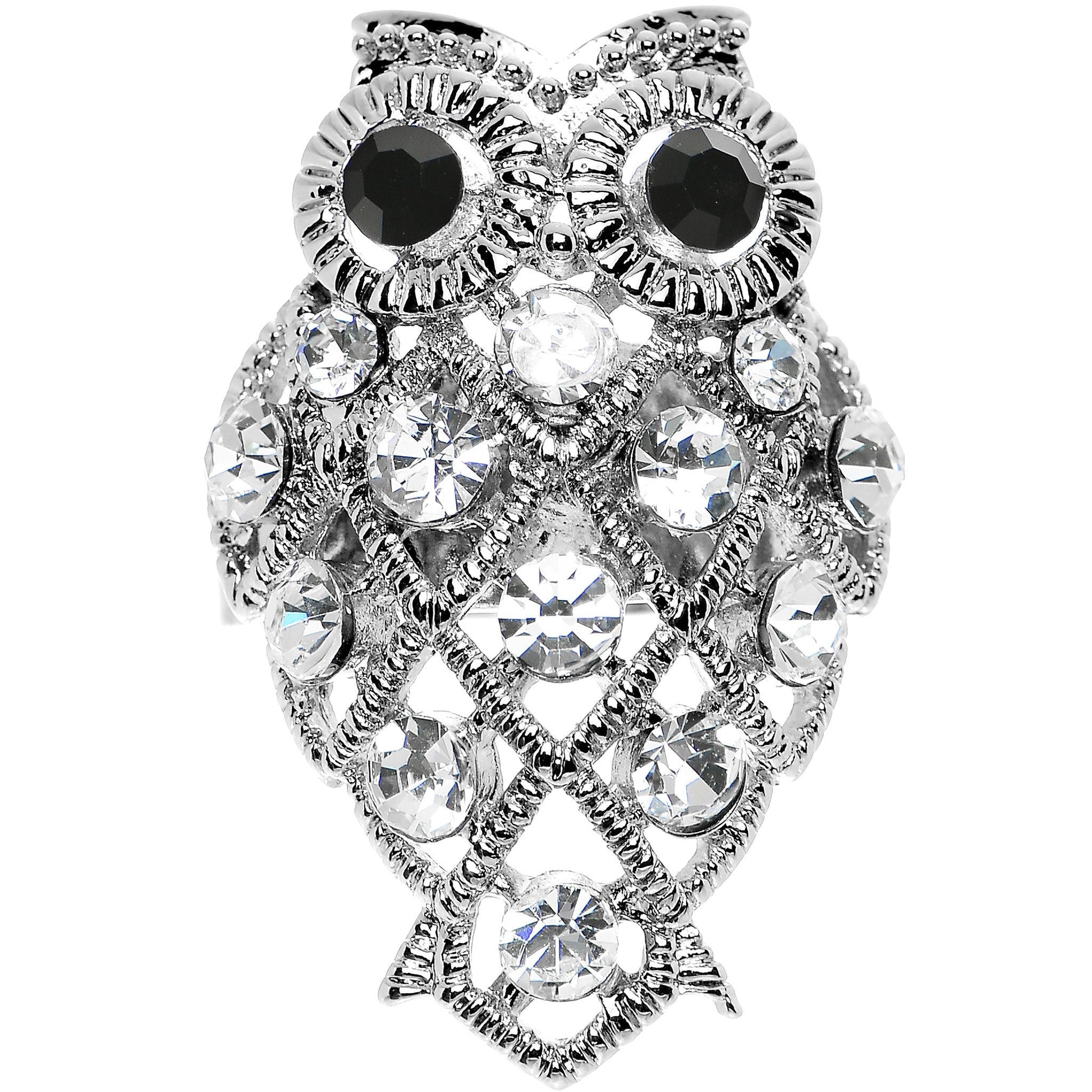 You will love the filigree framework of this fashionable owl ring. Gem cocktail ring with owl design. Adjustable monochrome finger ring.