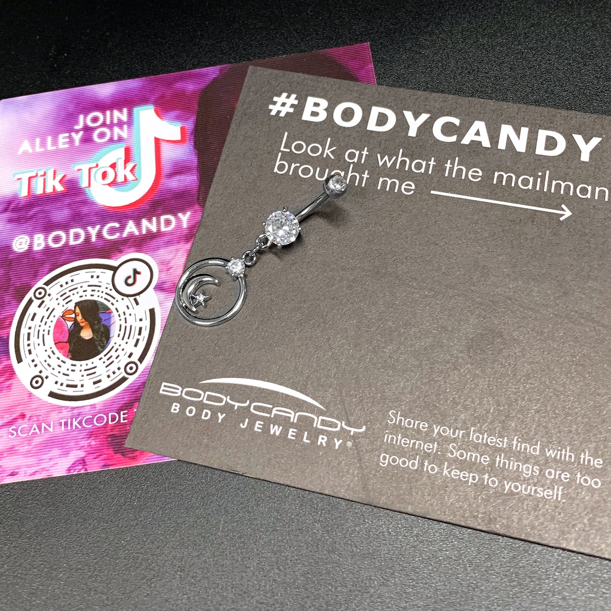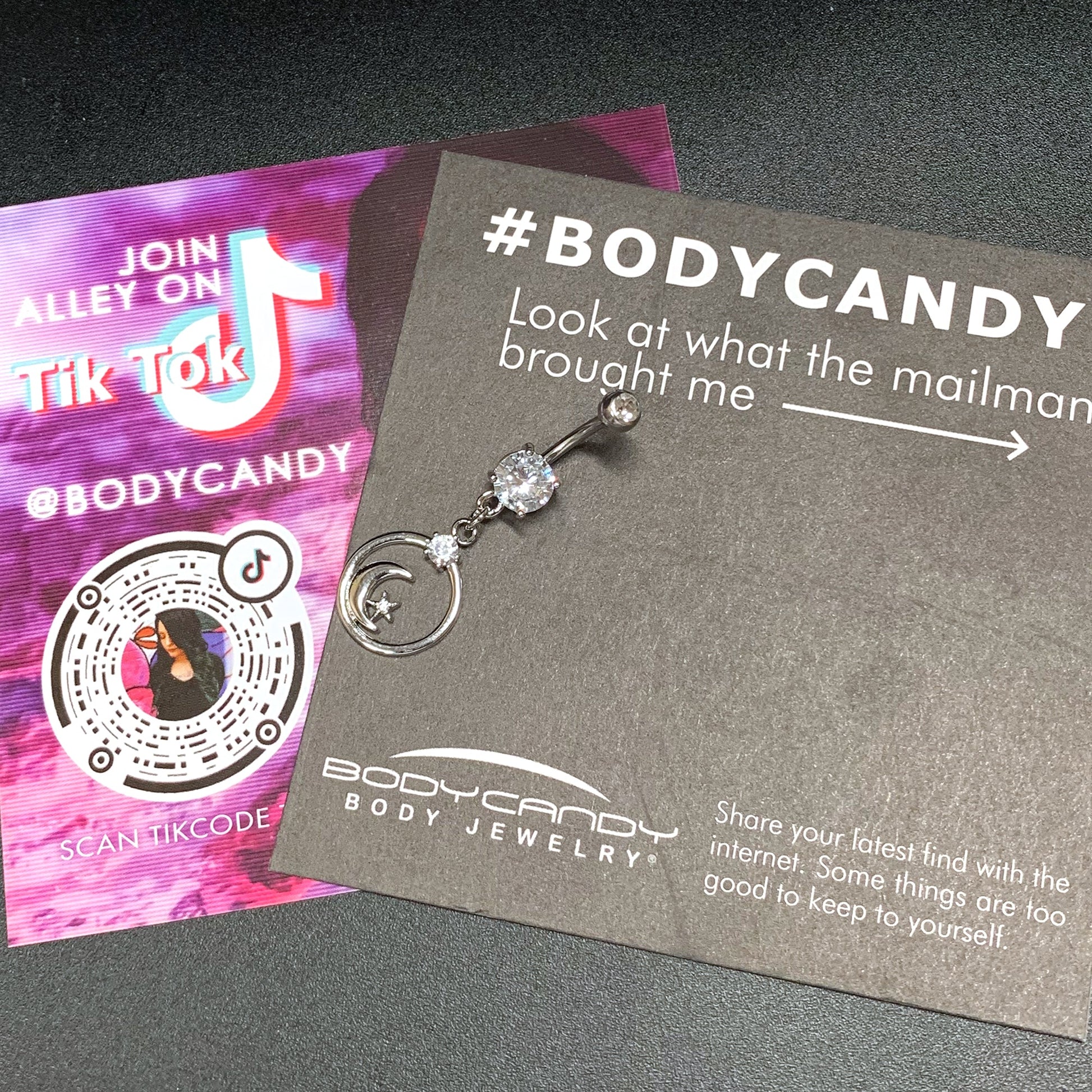 The night sky is looking super stylish on this 14 gauge navel ring! It's made with a 3/8" durable 316L surgical grade stainless steel curved barbell with a 5mm top ball end, which is set with a clear gem. The bottom end features a single large clear gem. Dangling beneath it is a a clear gem star, set at the top of circle. Sitting at the bottom of the circle is a crescent moon and another star, set with more clear gems. This celestial belly piercing ring is sure to have you looking absolutely heavenly!Specifications