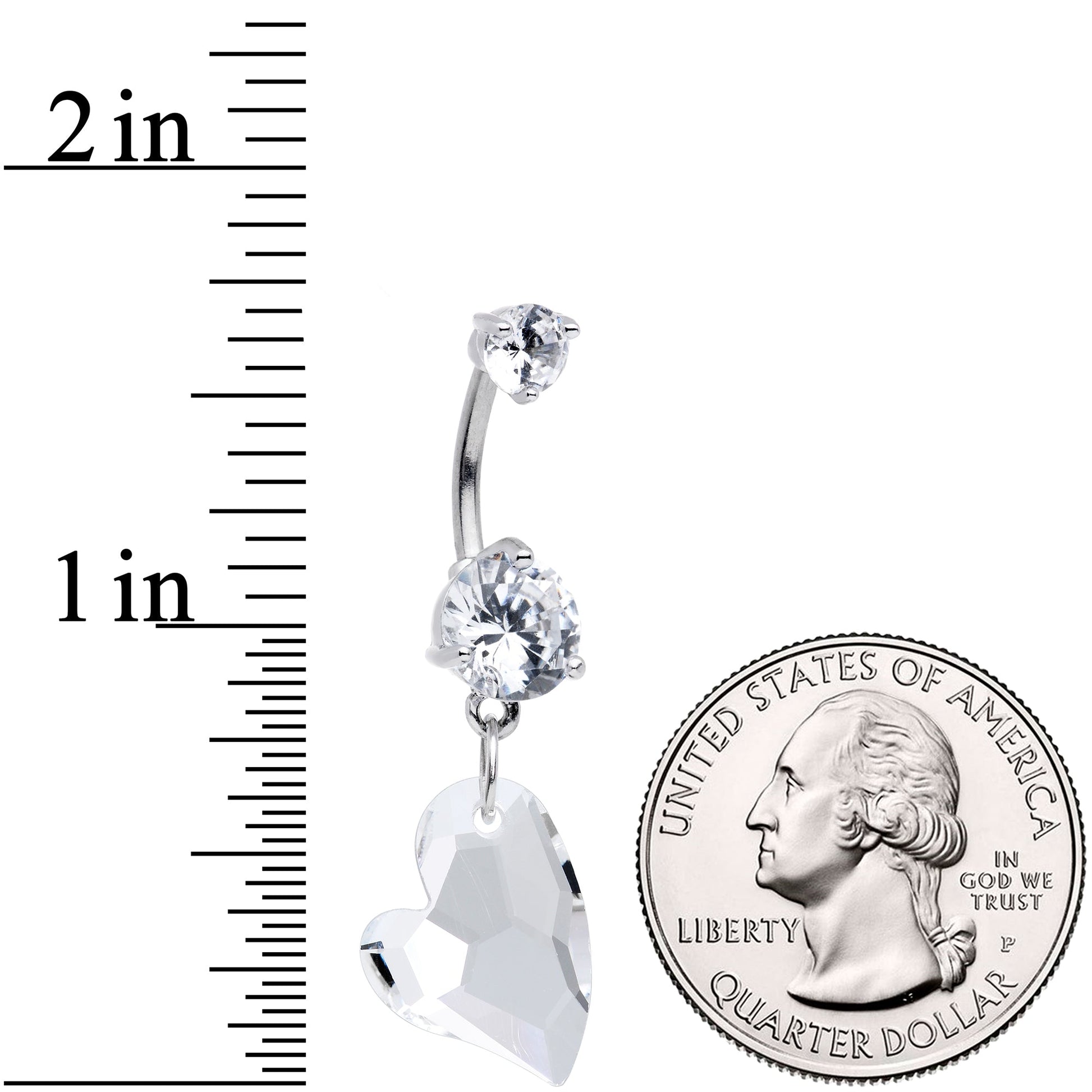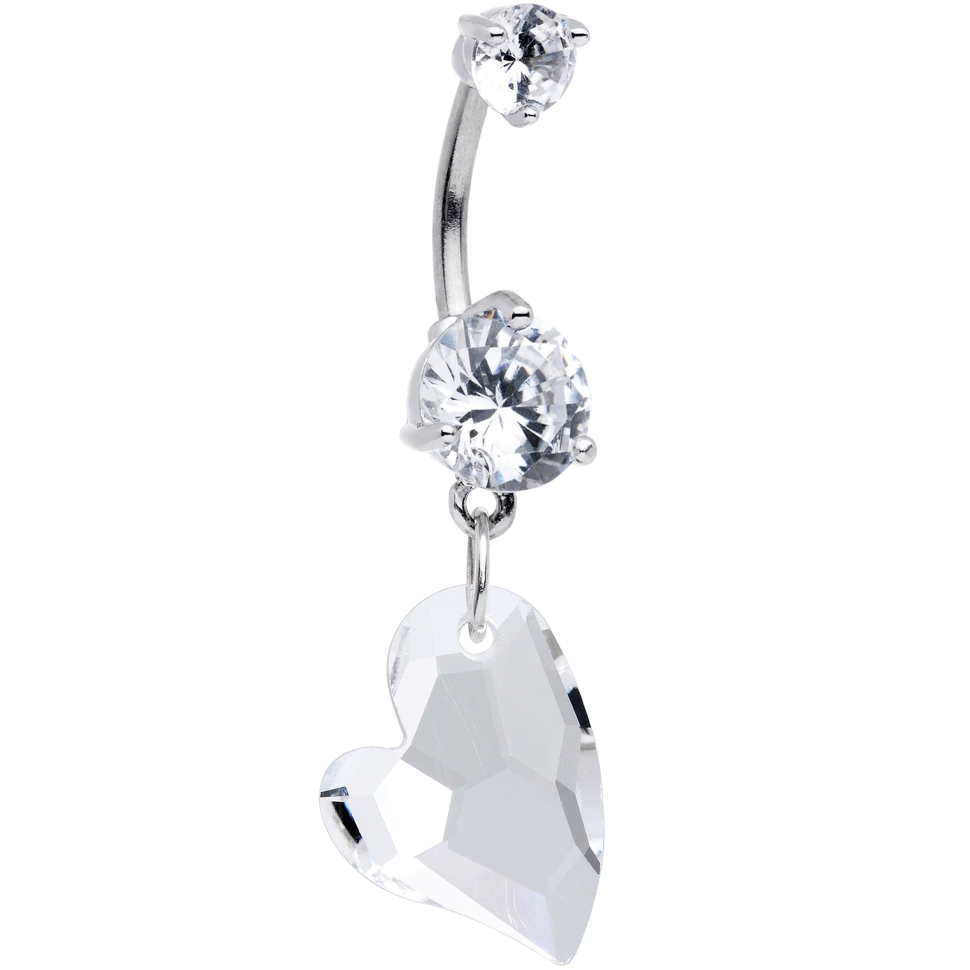 Why wear your heart on your sleeve when you can wear it in your navel piercings with this 14 gauge belly button ring? It's made with a 3/8" durable 316L surgical grade stainless steel curved barbell. The top end is a single clear gem and the bottom end is an even larger clear gem. Dangling from the base is a matching clear gem, faceted to ensure that it catches the light. The heart also has a stylized, elegant shape to it and it's set to hang a bit sideways for even more visual interest. This gorgeous, graceful navel ring is sure to steal your heart.Specifications