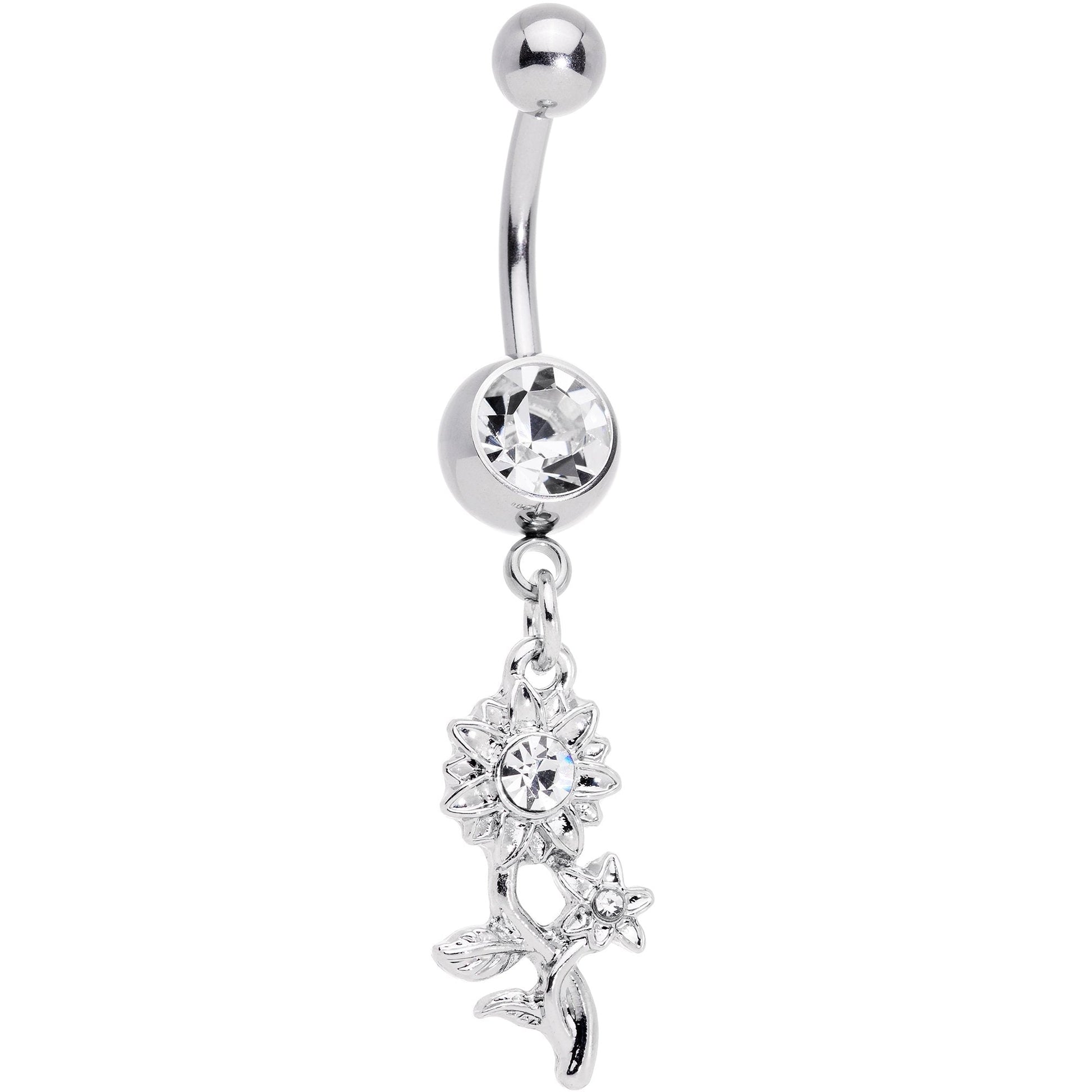 Get your summer style started right away when you wear this 14 gauge flower navel jewelry. Made with a 3/8" durable 316L surgical grade stainless steel curved barbell, this navel piercing features a clear bottom gem with a sunflower dangle set with clear gems.Specifications