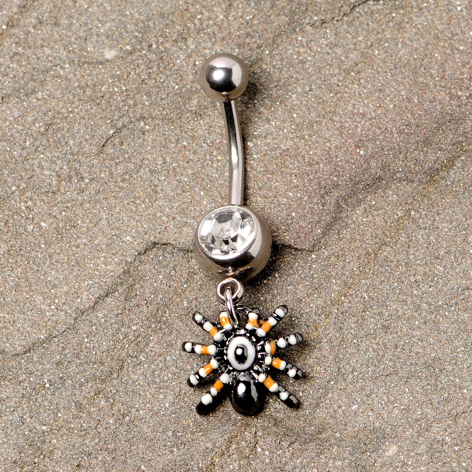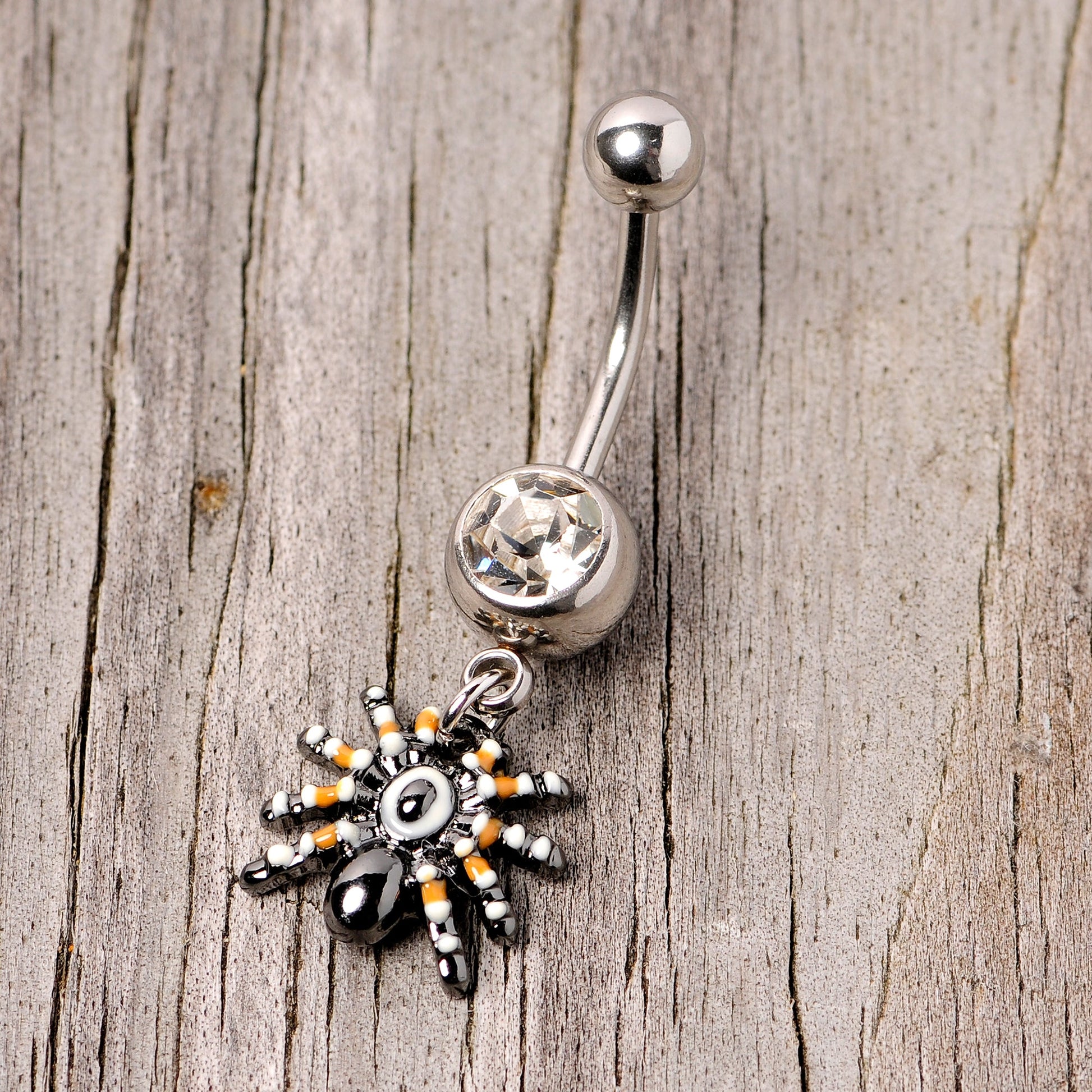 This eight-legged creepy-crawly is ready to wriggle into your navel piercing and make itself at home on this 14 gauge belly button ring! It's made with a 7/16" durable 316L surgical grade stainless steel curved barbell with a 5mm top ball end. The bottom ball end is 8mm and is set with a large clear gem. Dangling from the base is an arachnid spider charm, bedecked in sleek black with orange and white detailing for a realistic appearance. Whether you're smitten with spiders or just love Halloween, this tarantula is going to spin a wonderful web of style in your belly piercing!Specifications