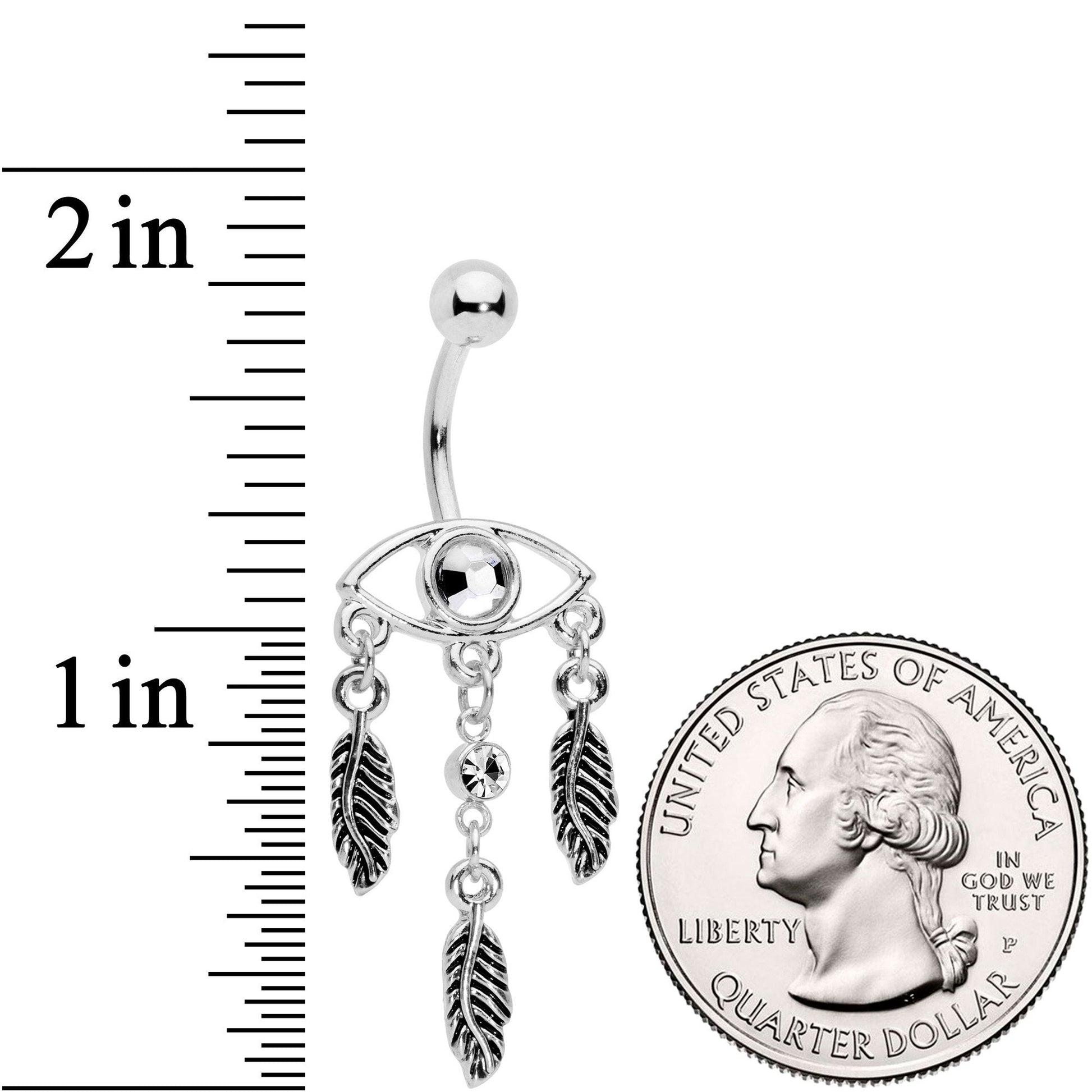 A navel ring this bold is downright visionary! It's 14 gauge and made with a 7/16" durable 316L surgical grade stainless steel curved barbell. At the base is an open eye with a clear gem for its pupil, showing everyone that you clearly see the world around you. But if that weren't enough, there are three feathers dangling from the bottom of the eye, with the center feather embellished with another clear gem. The feathers can sway and shift as you do, allowing you to show off its full effect every time you move. This eye sees the world - now it's time for you to let the world see it on you!Specifications