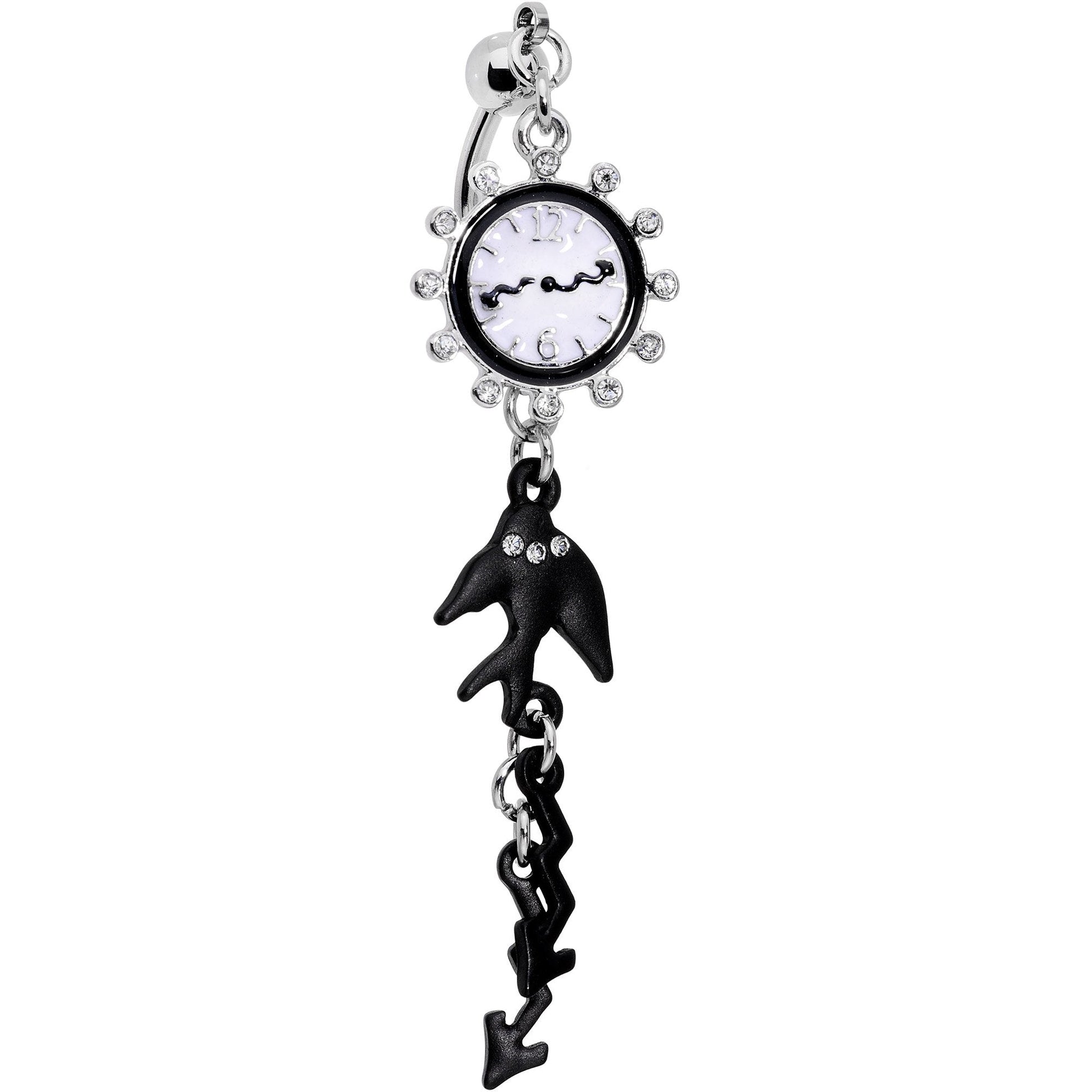 If you feel like it's time to show off your weird side, then this belly ring is perfect for you. A clear gem encrusted clock is adorned with whacky black charms on this top mount belly ring. The top down clock charm dangles from a 7/16" in length durable 316L surgical grade stainless steel curved barbell.Specifications