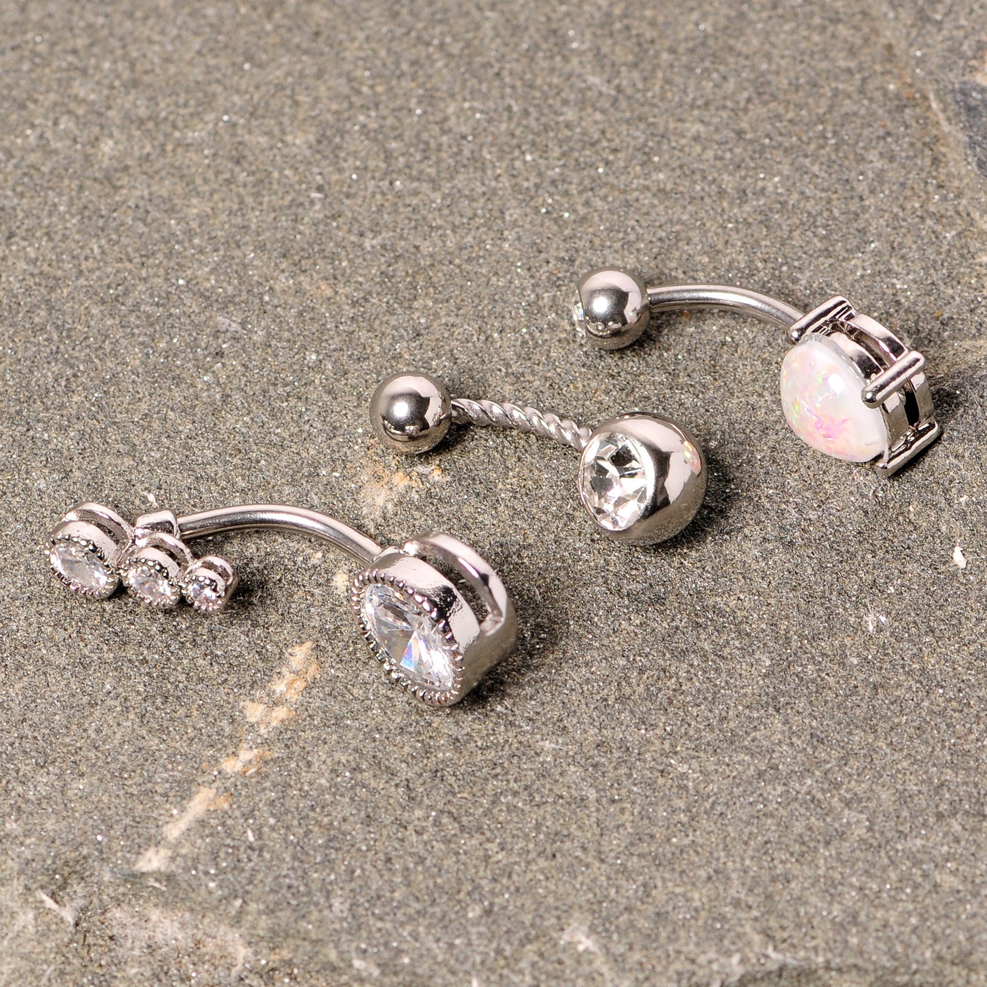 Elegance and glamour with a modern twist....all in this three-piece set of 14 gauge navel rings! Two are made with 3/8" durable 316L surgical grade stainless steel curved barbells. The first one has a 5mm top ball end that's set with a clear gem and the bottom end is a large white faux opal. The second one features a top charm of three clear gems that decrease in size. The bottom end is a single large matching clear gem. The third navel piercing is made with a 3/8" durable 316L surgical grade stainless steel twisted curved barbell. It features a 5mm top ball end and an 8mm bottom ball end that's set with a large clear gem. Give your belly piercing a twist with this set of striking belly button rings! Sold as a set of three.Specifications