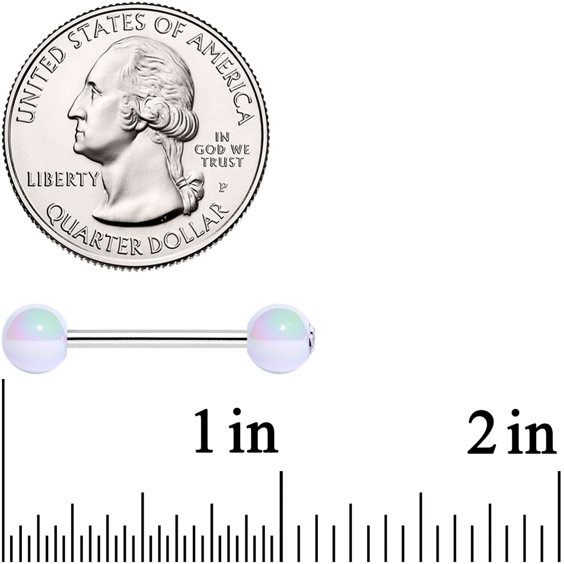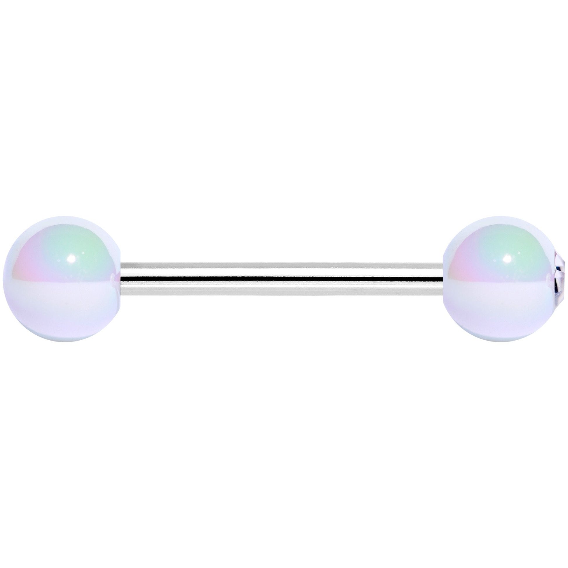 This 14 gauge tongue barbell just proves that simplicity never has to be plain. This 5/8" piece is made with a durable 316L surgical grade stainless steel straight barbell and has 6mm acrylic ball ends. The top ball end is set with a clear gem and both bottom and top are a rich pearlescent white that shifts to hints of pale pink. Simple, elegant, classic.....but certainly not plain.Specifications