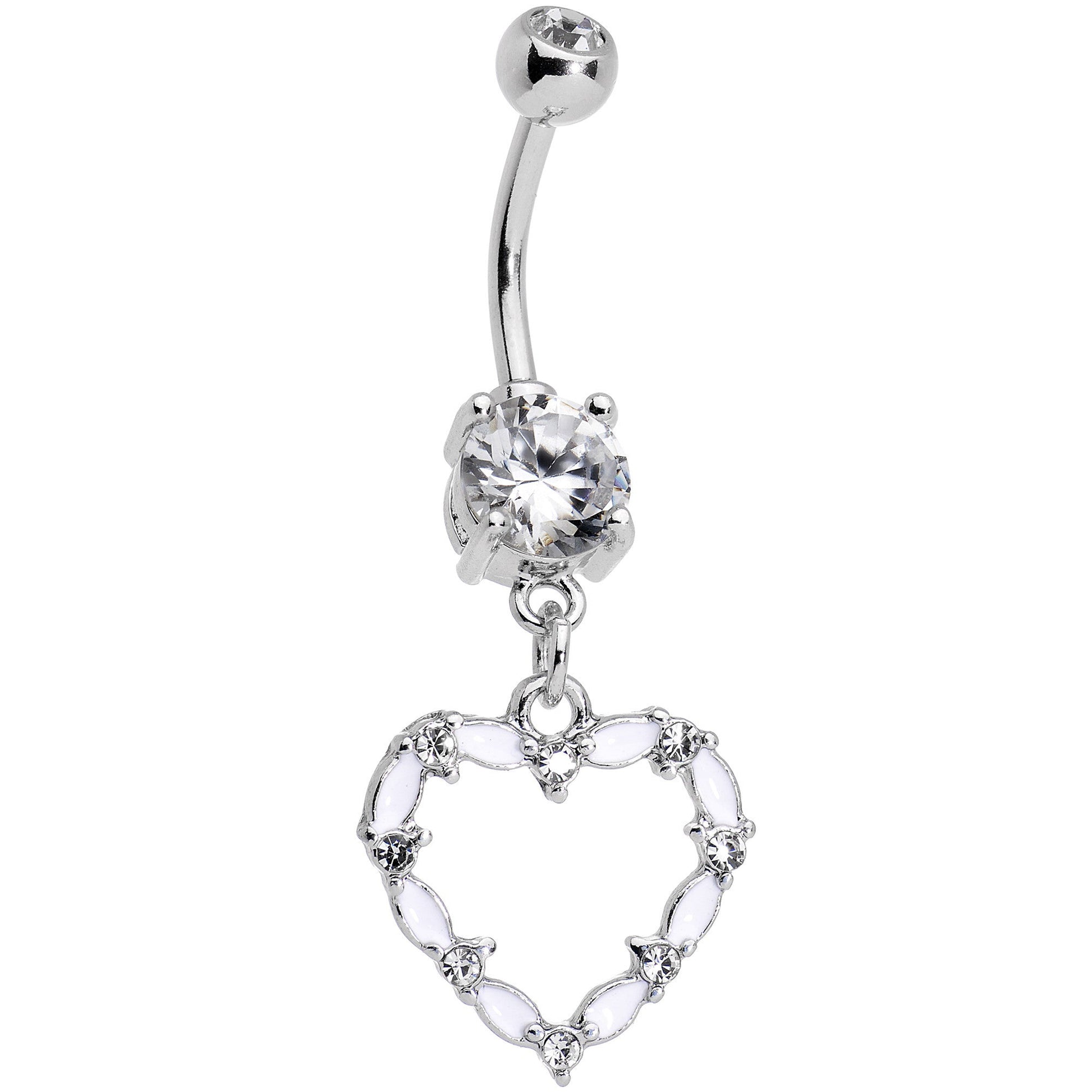 Dress up your belly button with this cute whole heart 14 gauge dangle navel piercing. Made with a 7/16" durable 316L surgical grade stainless steel curved barbell, this belly button ring features a heart charm lined with clear gems and white accents. The curved barbell comes complete with clear top and bottom gems.