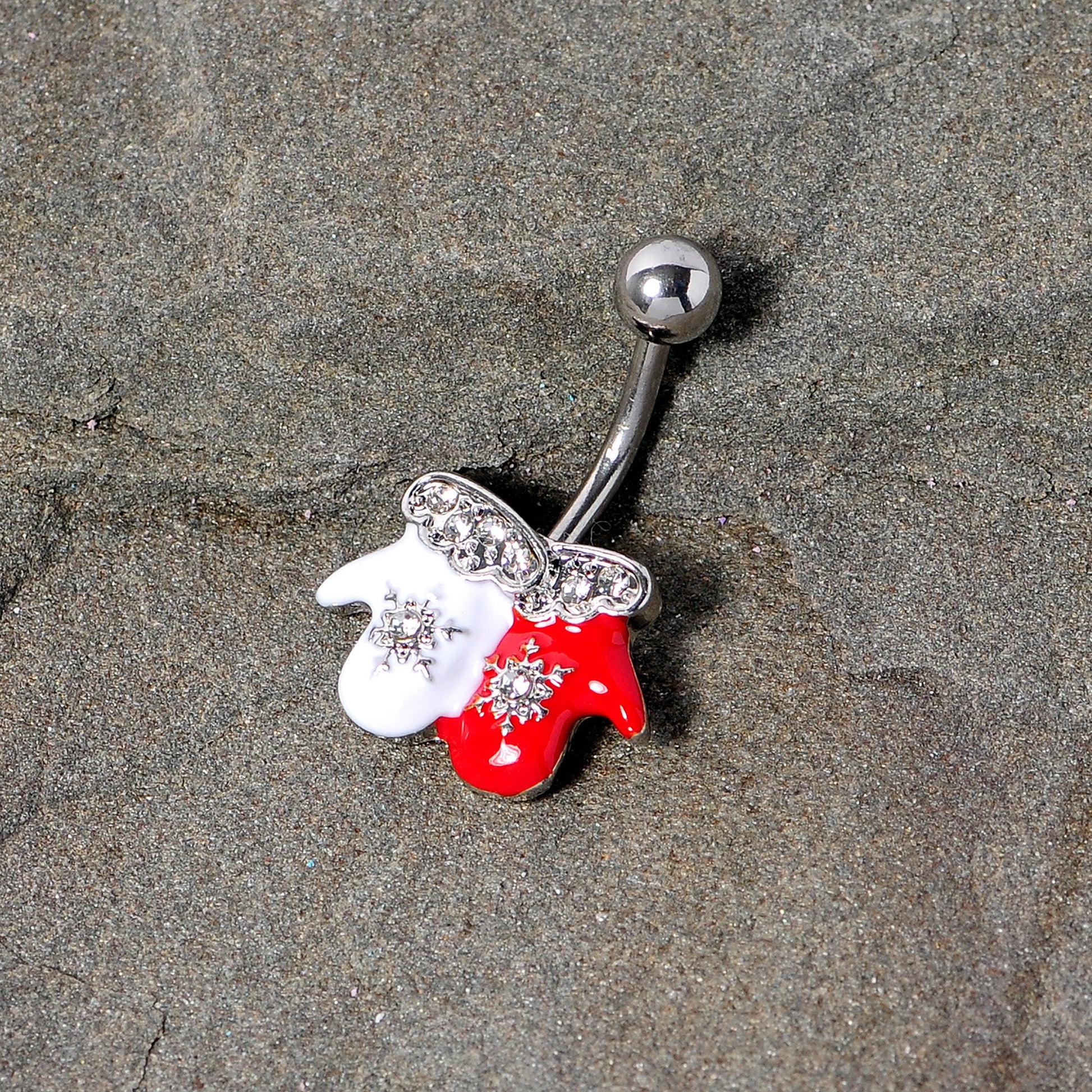 If you can't wait for the first snow day this holiday season then this 14 gauge Christmas belly button ring is right for you! made with a 10mm durable 316L surgical grade stainless steel curved barbell, this navel ring features a red and white winter mittens charm complete with clear gem star details and clear gem liners along the top of the charm that makes the winter gloves look warm and fashionable too!Specifications