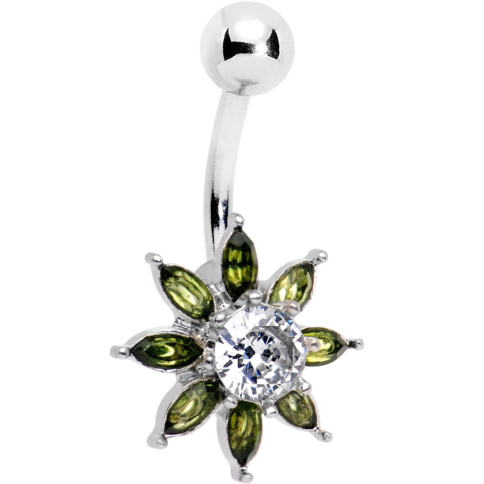 Dress up your navel with this fun floral belly ring. A sunny flower charm is decorated with eight green gem petal accents and a central clear gem to give it that extra bit of sparkle. The flourishing flower charm is mounted on a 7/16" in length curved barbell made with durable 316L surgical grade stainless steel.