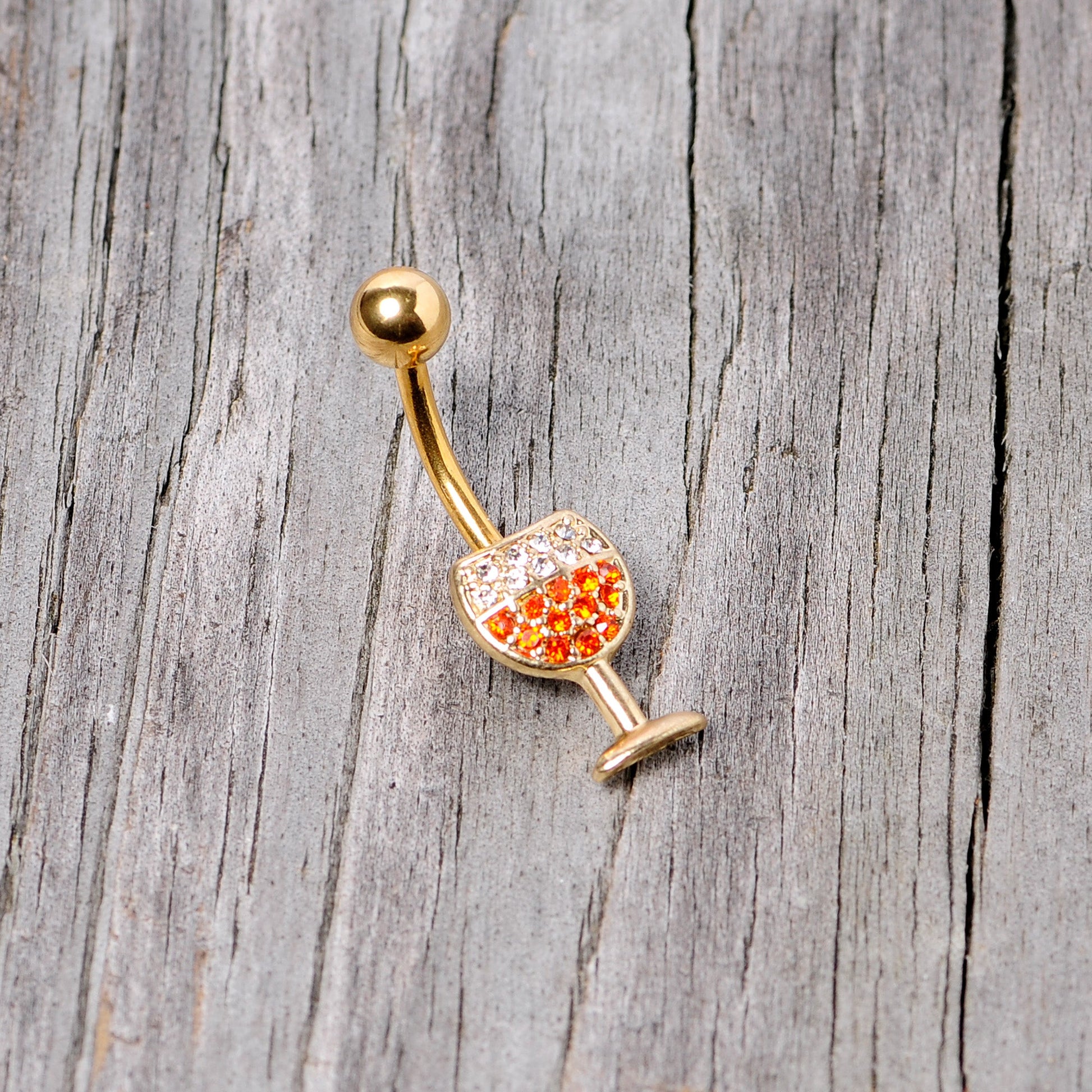 If you can't wait to celebrate the Christmas season, or any holiday including Thanksgiving, Halloween, New Year's Eve, and even Easter, then this festive 14 gauge navel ring will be a favorite in your collection. Made with a 3/8" gold tone PVD over 316L surgical grade stainless steel curved barbell, this belly button ring features a glass of wine bottom charm set with clear and orange gems that looks just like a celebratory drink!Specifications