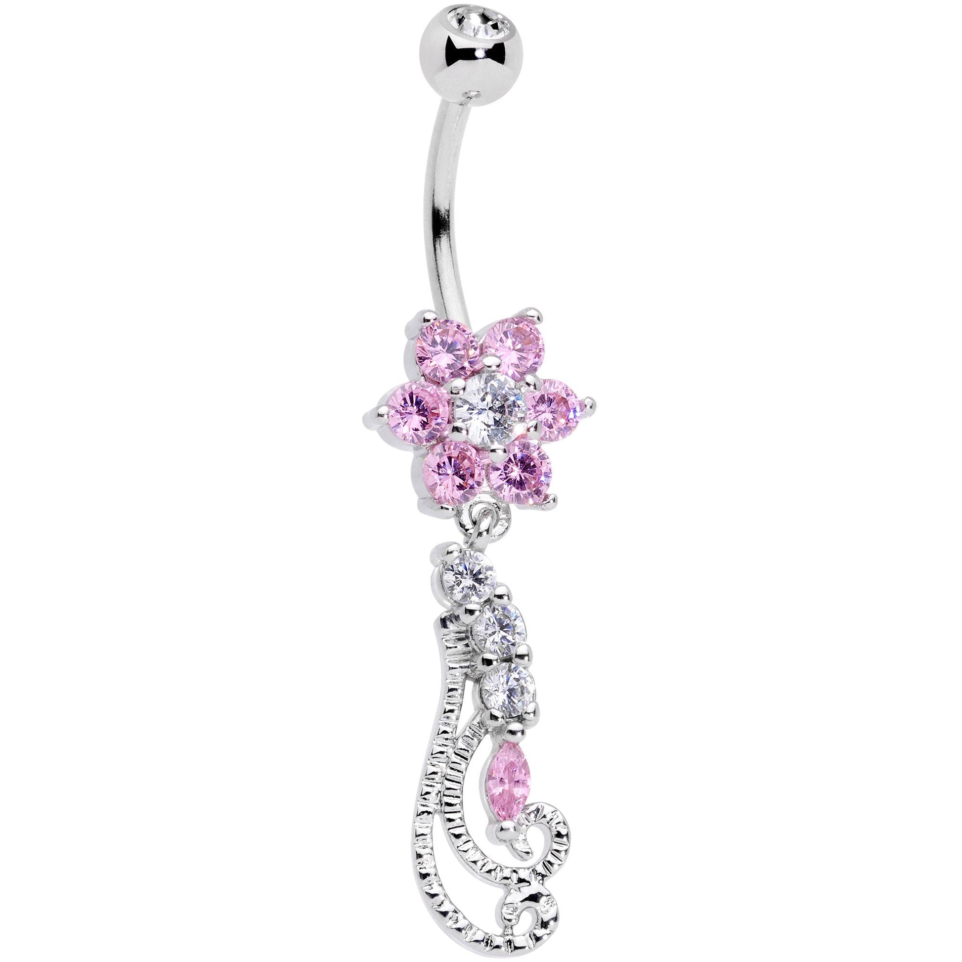 If your look is all glitz and glamour, this 14 gauge navel ring is the perfect finishing flourish for your formal fashion! It's made with a 3/8" durable 316L surgical grade stainless steel curved barbell and has a 5mm top ball end set with a clear gem. The bottom end is a six-petaled flower, composed of pink cubic zirconia gems with a clear cubic zirconia gem set at its center. Dangling from the base is a scrollwork flourish, further embellished with three more clear cubic zirconia gems and finished with a small pink cubic zirconia gem for a united appearance. Perfect for prom.....even better for year-round!Specifications