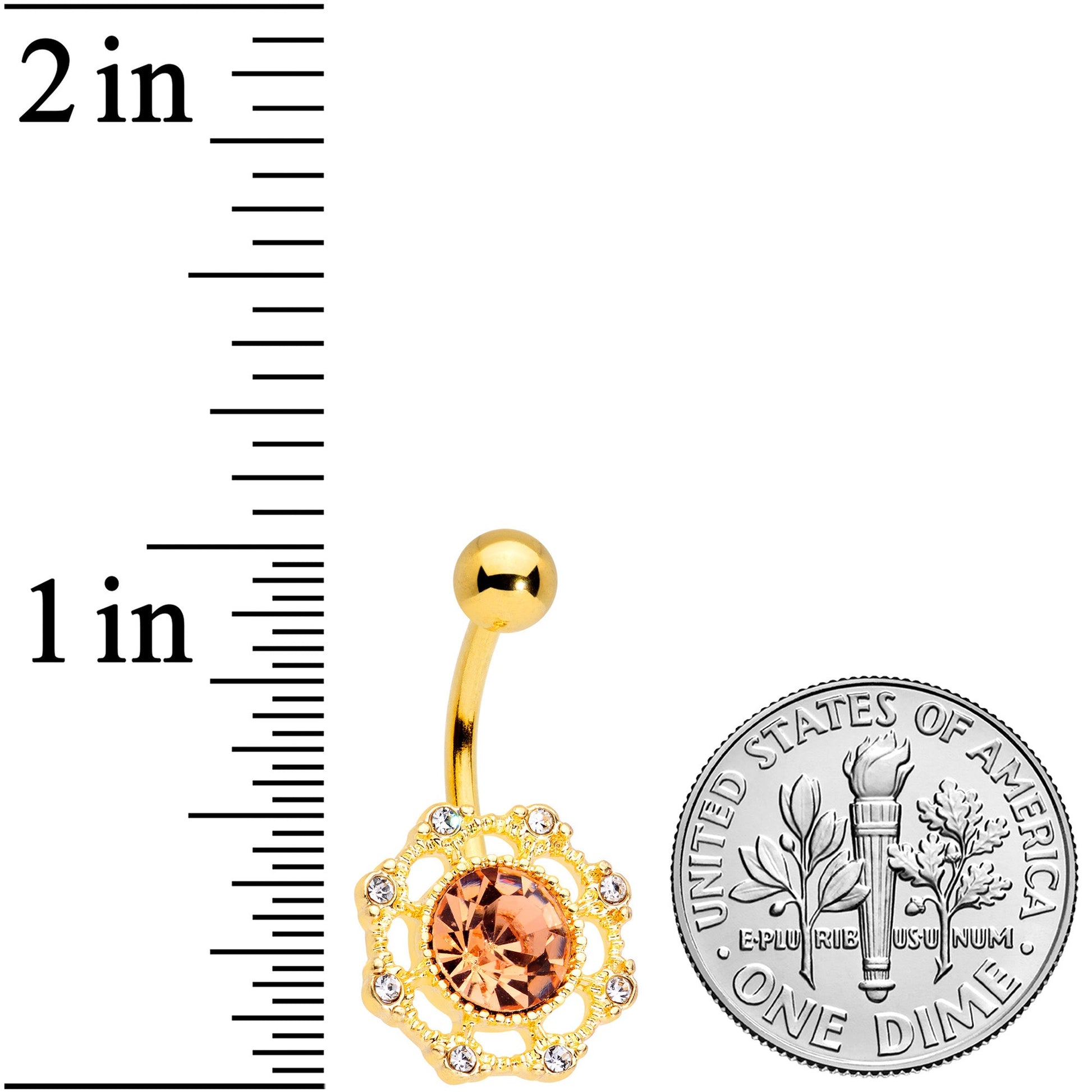 Like the Earth revolves around the sun, this 14 gauge navel ring will have all eyes revolving around you! It's made with a 3/8" gold tone plated over 316L surgical grade stainless steel curved barbell with a 5mm top ball end. The bottom end features a circular charm with a smoky pink cubic zirconia set at its center. Around it sits a ring set with clear cubic zirconia gems for a subtle touch of luxury. Let everyone know you're the center of the universe with this chic, circular-themed belly button jewelry!Specifications
