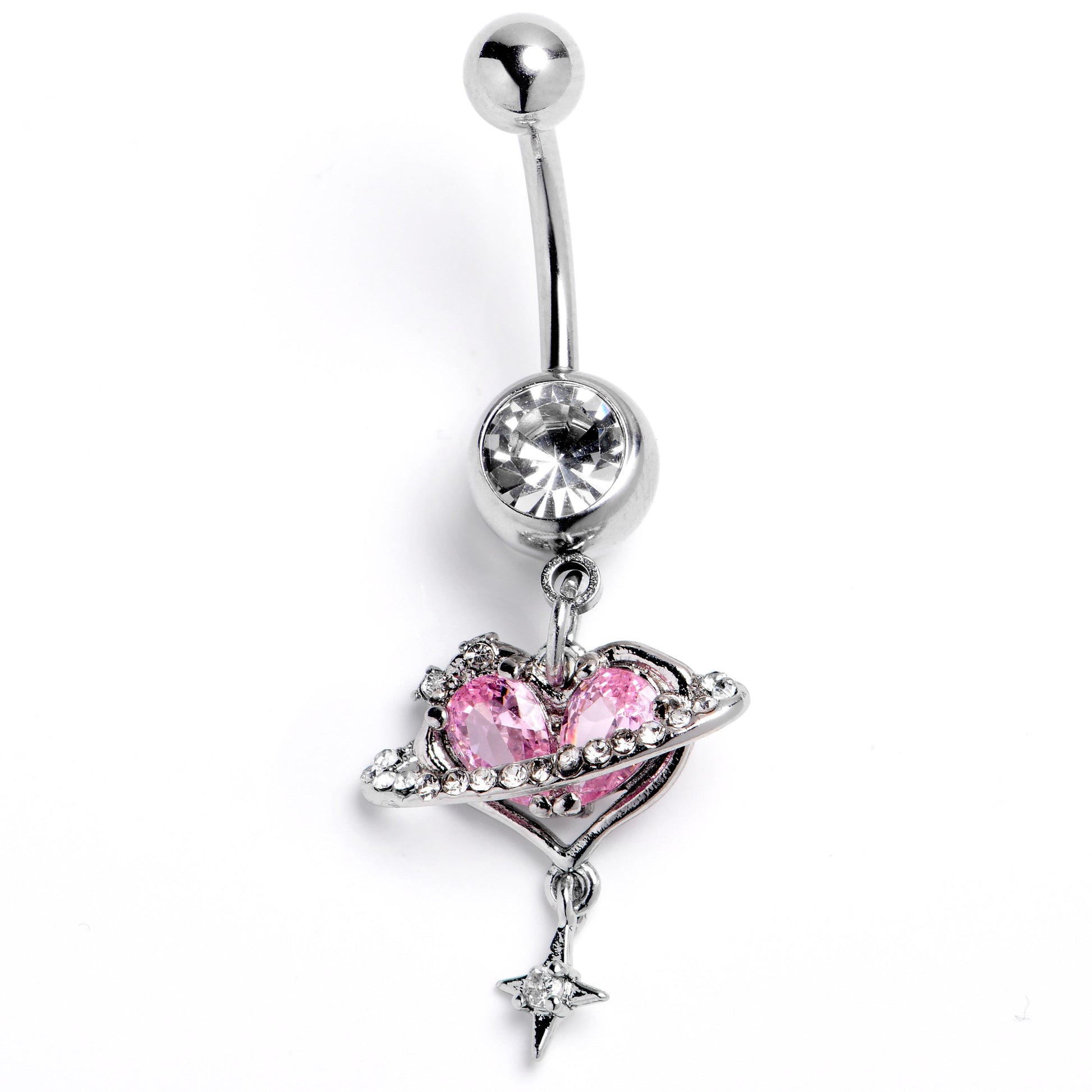 Clear Pink CZ Gem Starry Heart Dangle Belly Ring
