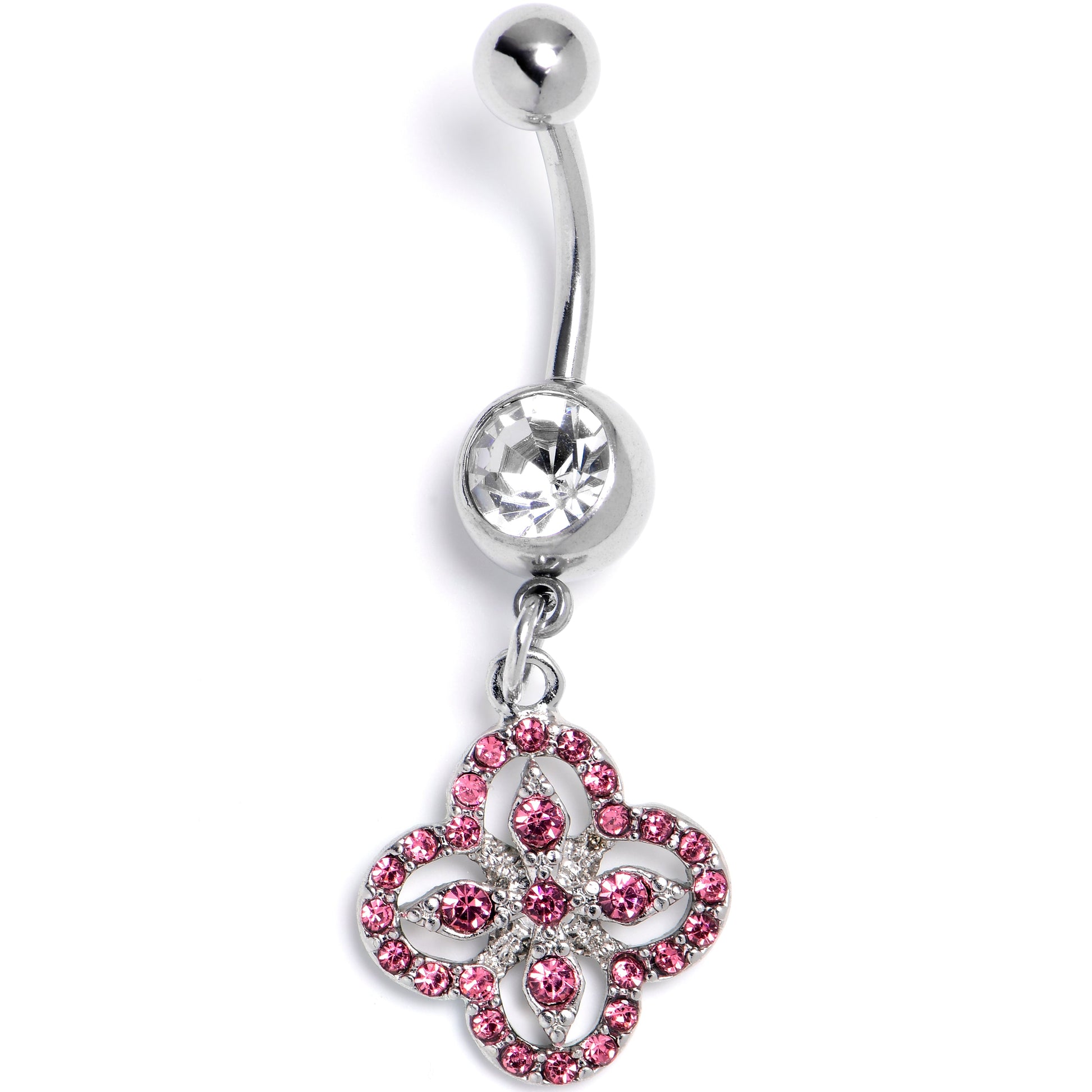 This stately, stylized 14 gauge navel ring adds an stylish touch to a spiritual piece. It is made with a 3/8 inch 316L surgical grade stainless steel curved barbell with a 5mm top ball end. The bottom ball end is 8mm and set with a clear gem. Dangling beneath is a stylized cross charm, with a curved, openwork design that's embellished with pink gems throughout for a touch of color that truly gives this piece a stylish feel. Once you have this belly piercing jewelry in, taking it out will never cross your mind.Specifications
