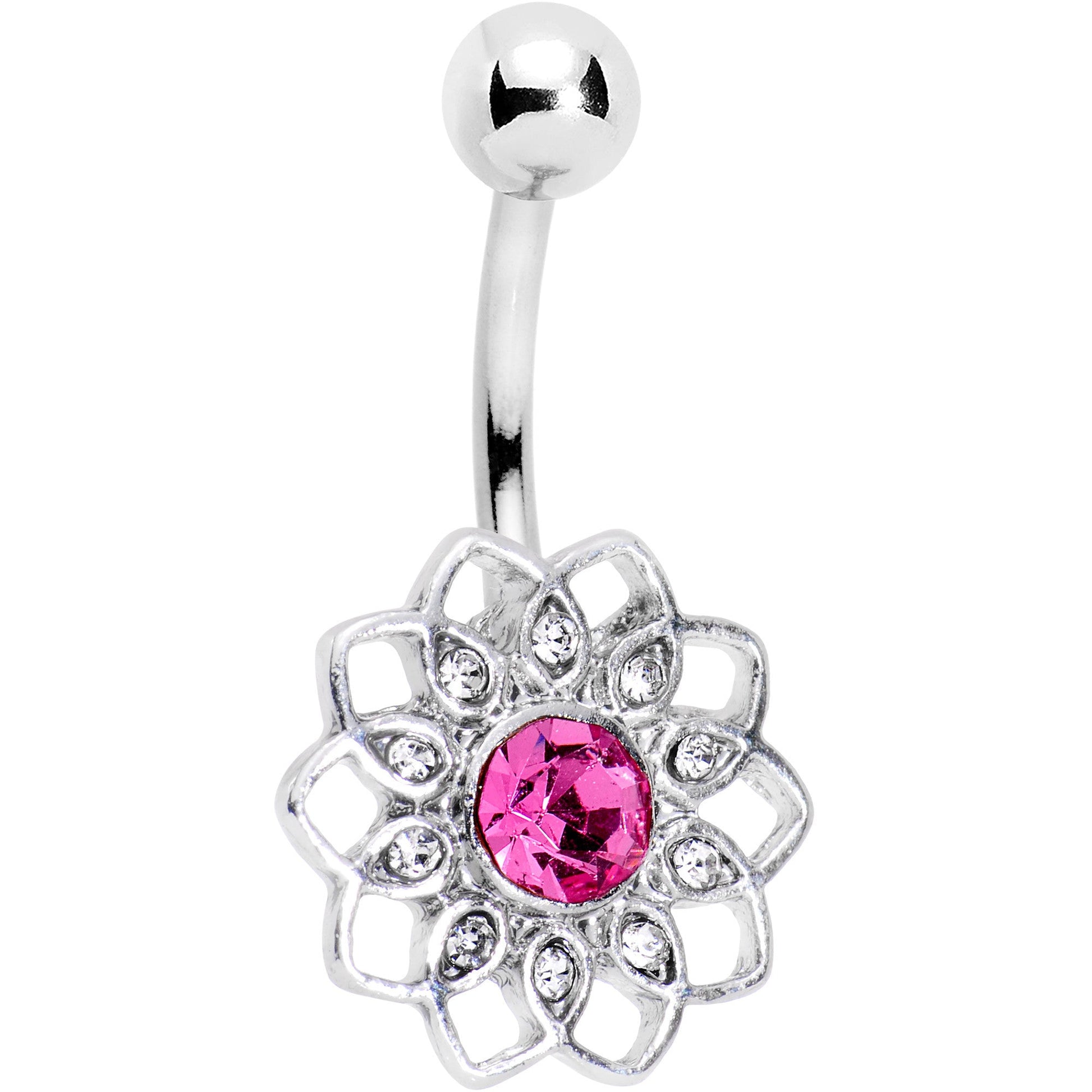 Show off your love of delicate simplicity when you wear this pretty 14 gauge belly button ring. Made with a 7/16" durable 316L surgical grade stainless steel curved barbell, this navel piercing features a framework flower bottom charm set with clear gems and a single central pink gem for eye-catching beauty.