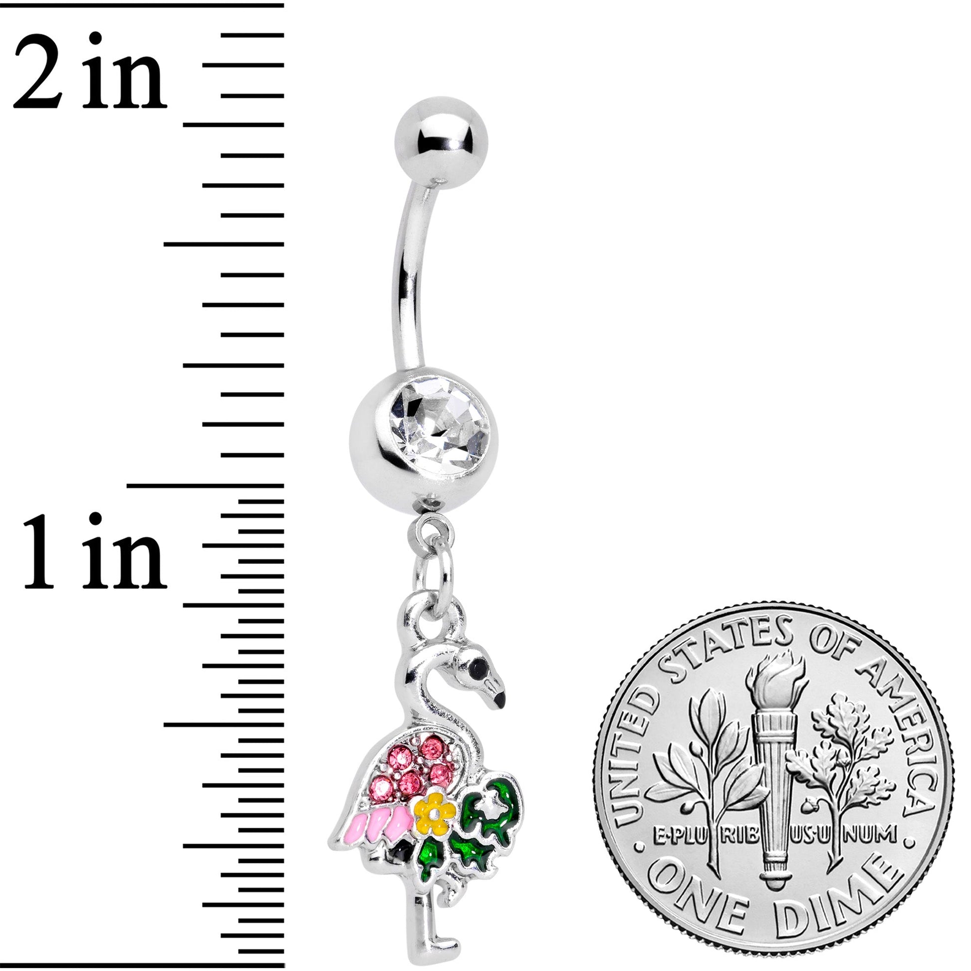 The flamingo on this 14 gauge navel ring has funky style to spare! It's made with a 3/8" durable 31`6L surgical grade stainless steel curved barbell with a 5mm top ball end. The bottom ball end is 8mm and set with a large clear gem. Dangling beneath it is a flamingo charm with its iconic one-legged stance. The flamingo is along the wing with pink gems for a traditional yet fashionable appearance. It's further embellished with pink inlay and a floral embellishment inlaid in green and yellow. Get a little funky like our feathered friend on this dangle flamingo belly button jewelry!Specifications