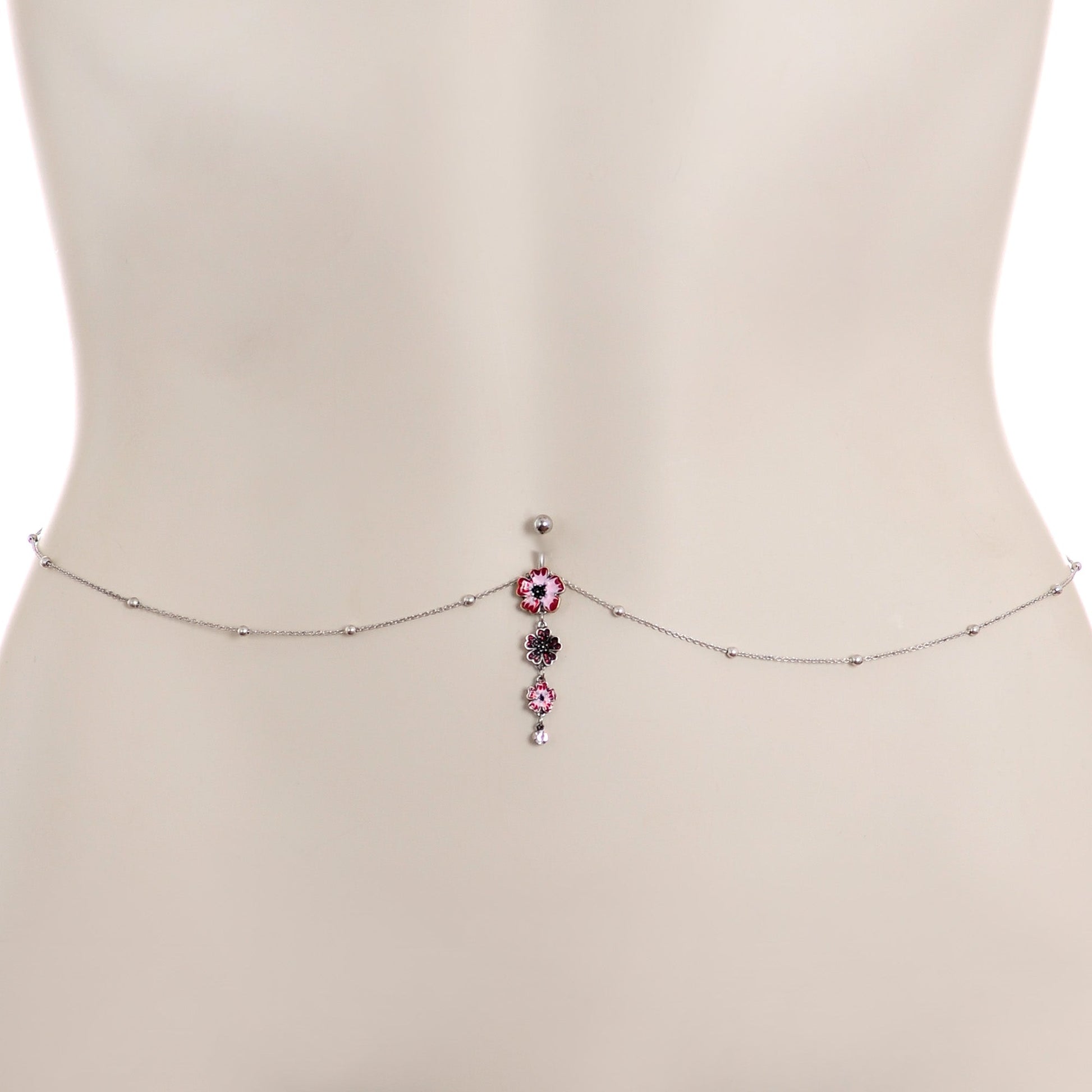 Clear Pink Gem Pink Tropical Flower Dangle Belly Ring Belly Chain