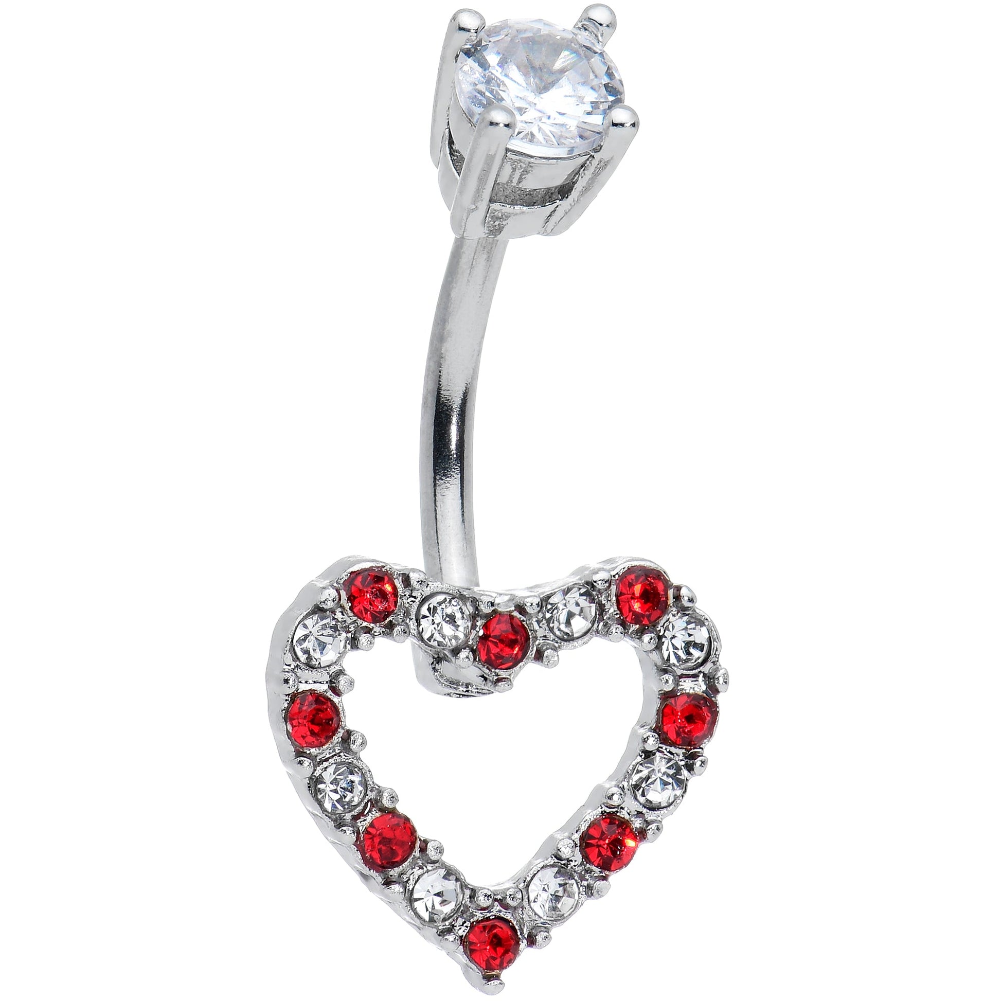 Remember to keep your heart open with this 14 gauge navel ring! It's made with a 3/8" durable 316L surgical grade stainless steel curved barbell. The top end is composed of a single clear gem. The bottom end features a heart charm. The heart is open at the center and composed of alternating red and clear gems for a cohesive appearance. Keep your heart open and love will follow - and you're sure to love this belly button jewelry!Specifications
