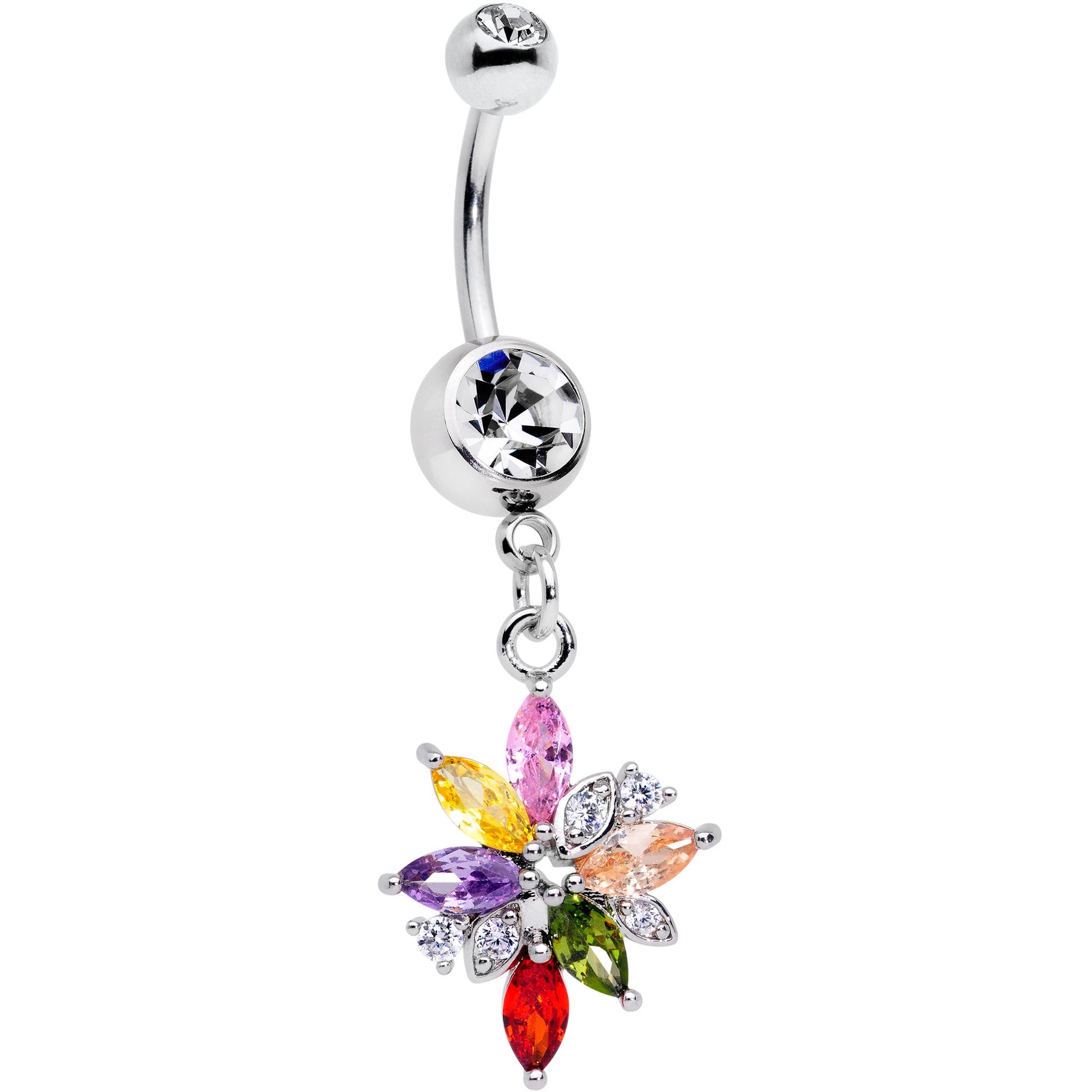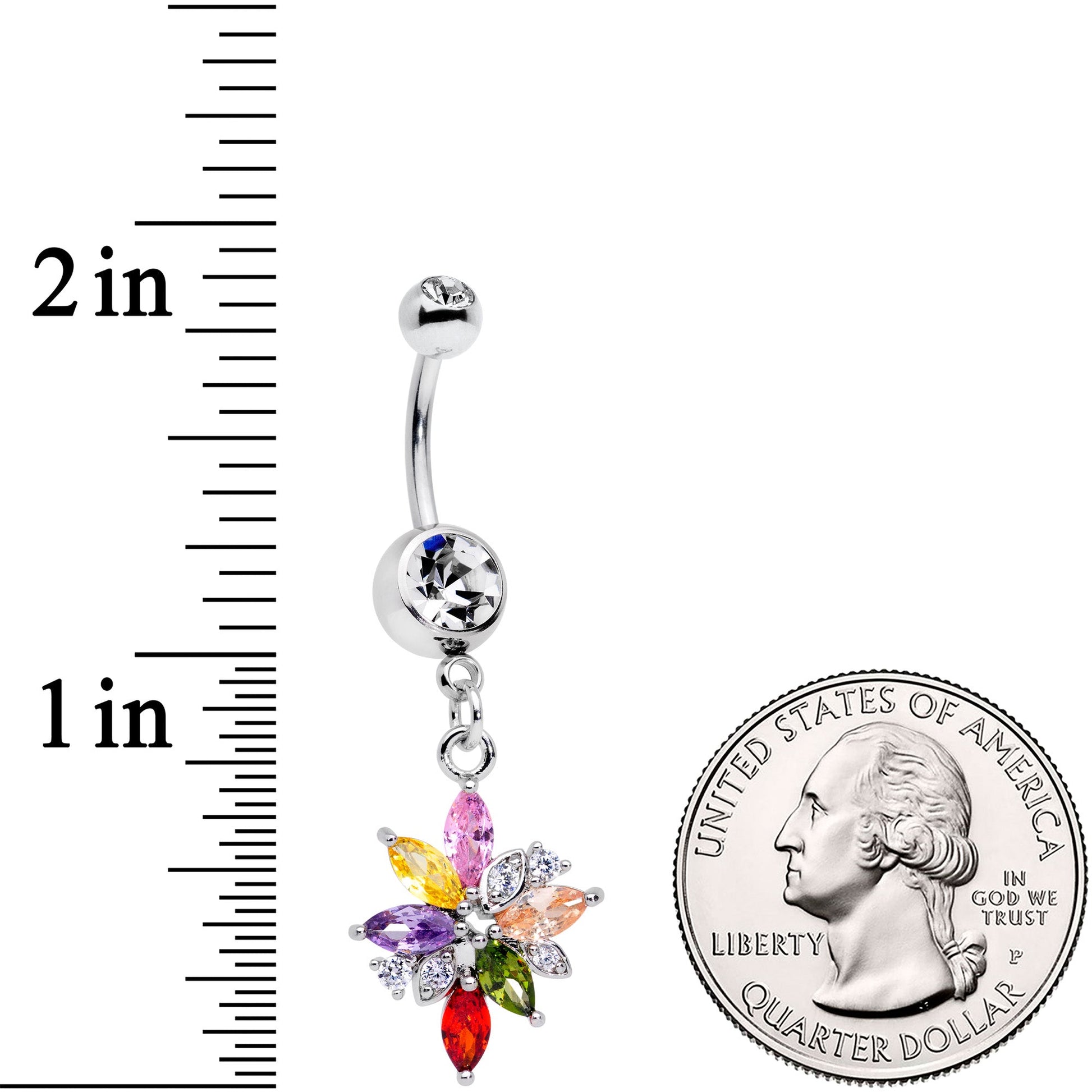 If you like your jewelry to stand out in a crowd, this 14 gauge navel ring is sure to please! It's made with a 3/8" durable 316L surgical grade stainless steel curved barbell. The 5mm top ball end is set with a clear gem, as is the 8mm bottom ball end. Dangling beneath is a large cluster of gems in an array of colors - red, yellow, blue, purple, pink, and clear. This belly button jewelry is sure to get noticed!Specifications