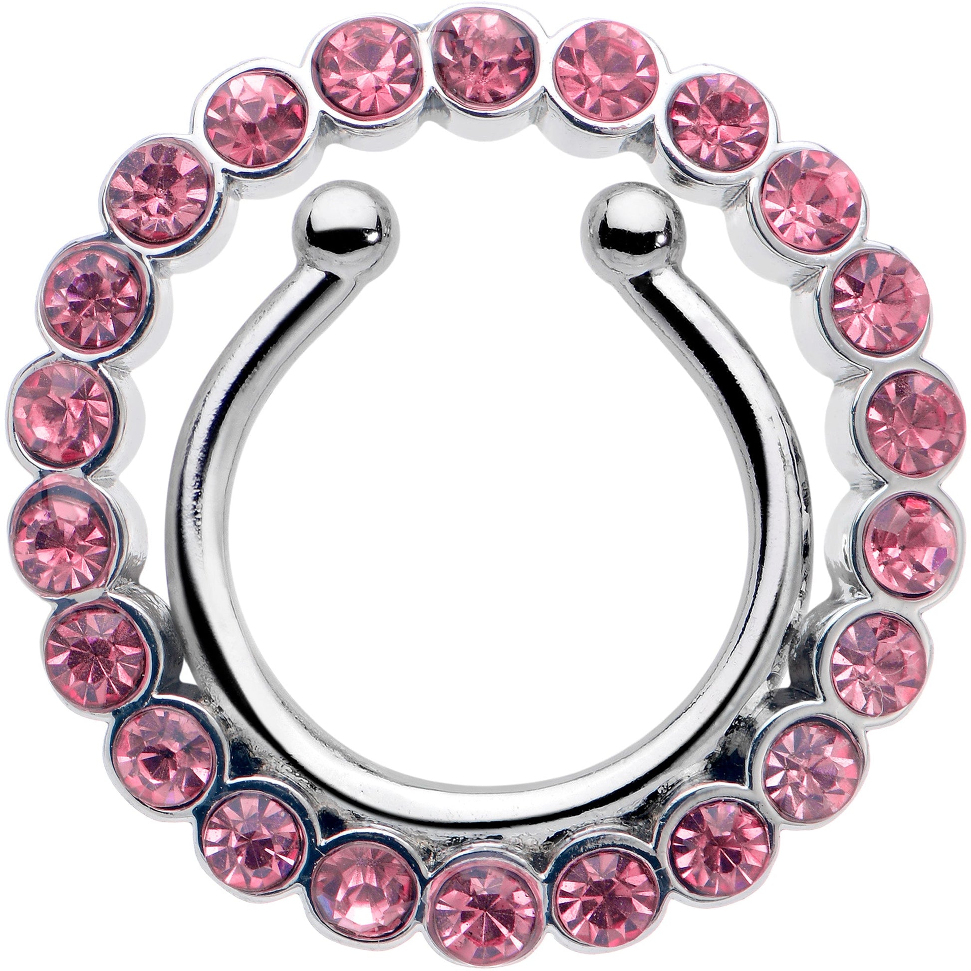 If you like the look but aren't ready to commit yet, this faux nipple piercing jewelry is perfect for you. They are made with stainless steel and features two ends that you press together to hold it securely in place without the need of a trip to the piercer. They each feature a circle of pink gems for a fanciful look that is full of style. Try out a new look before you commit with these faux nipple piercing rings. Sold as a set of two.