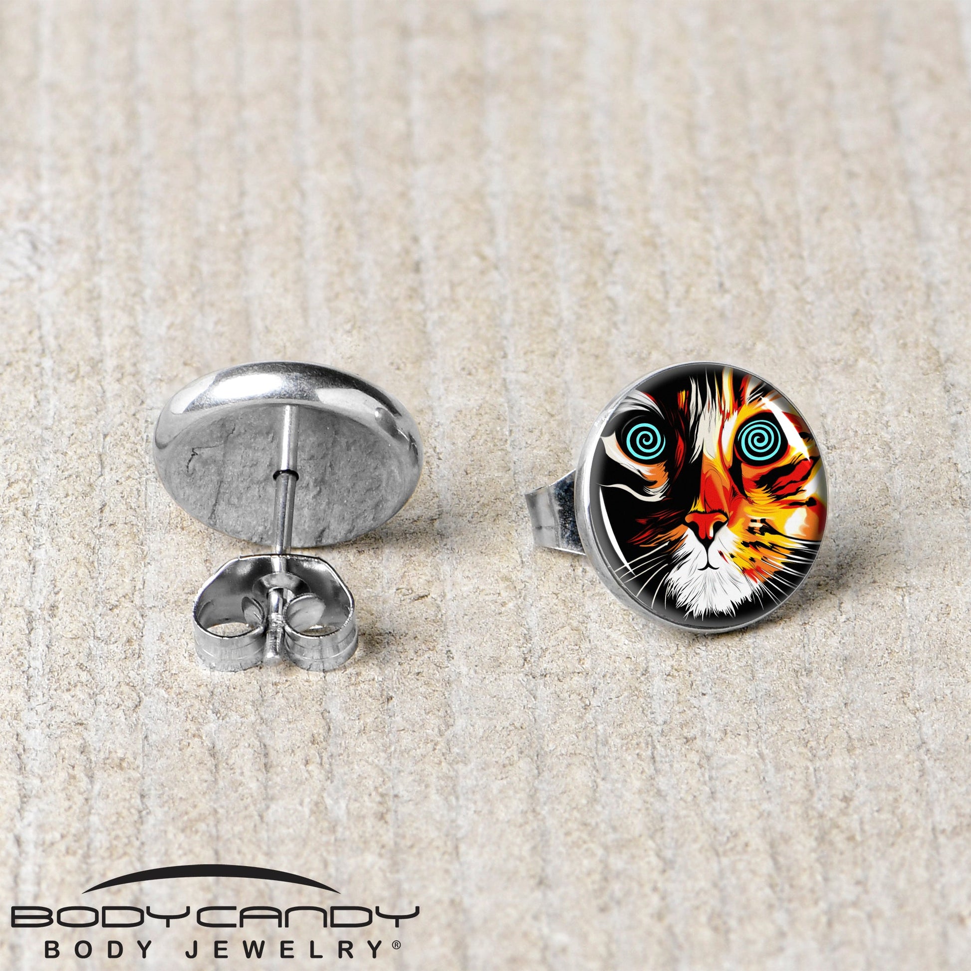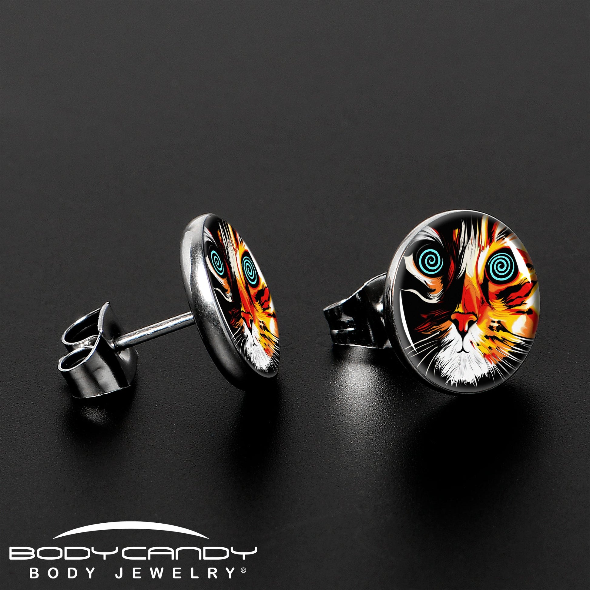 Hypoallergenic jewelry for sensitive skin.Colorful Trippy Cat Stud Earrings