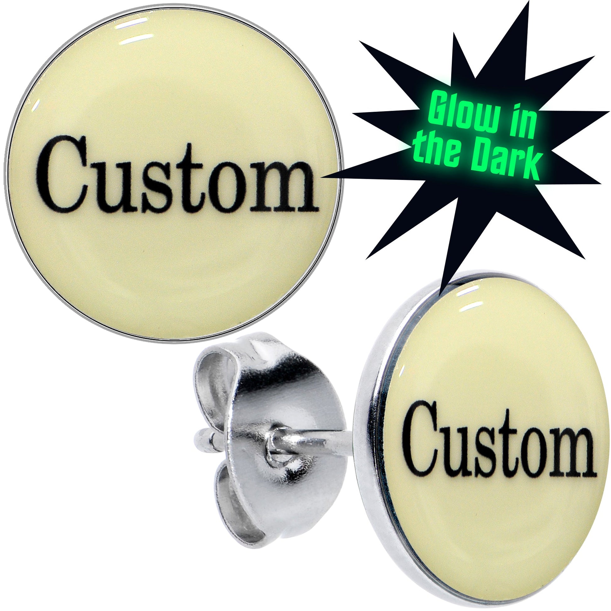 Hypoallergenic jewelry for sensitive skin.Create your own one of a kind personalized earrings. These 10mm custom earrings make a great keepsake; earrings that are sentimental and also a wonderful gift idea. Custom stud earring jewelry. Custom text pieced earrings