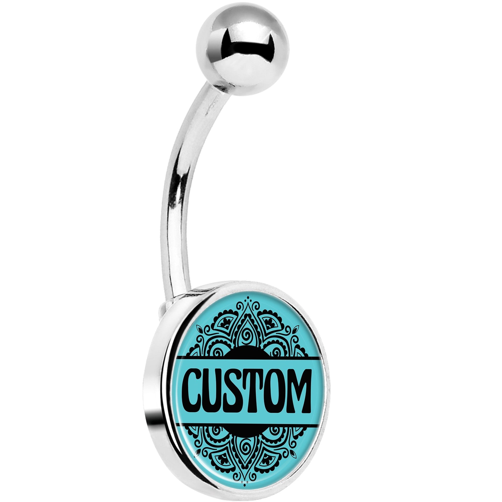 Take your gift-giving to the next level when you personalize this custom 14 gauge belly button ring. This navel ring is made with a 7/16" durable 316L surgical grade stainless steel curved barbell with a black mandala and lettering on teal background logo inlay that features custom text with the 6 character name or message special to you. Customizable navel jewelry is a unique gift idea that preserves the name or message that are special to you or someone you love.