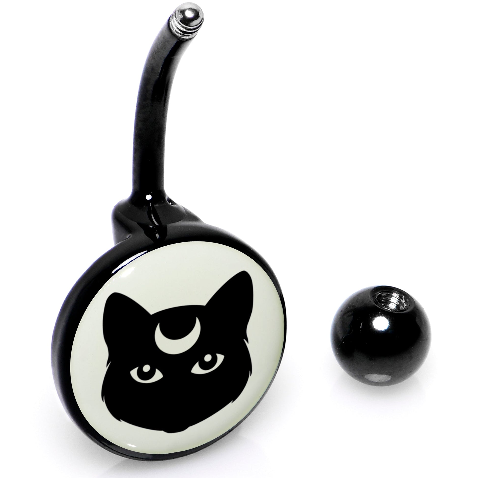 The cat on this 14 gauge navel ring appears to have been blessed with mystic wisdom. It's made with a 7/16 inch black anodized titanium over 316L surgical grade stainless steel curved barbell with a 5mm top ball end. The bottom end features a white disc charm with a black cat's face on it. The cat has simply detailed eyes and a crescent moon on its forehead and when the lights go down it glows in the dark. Let this cryptic kitty cat cast a spell of style on your look with this delightfully mystical belly piercing jewelry.