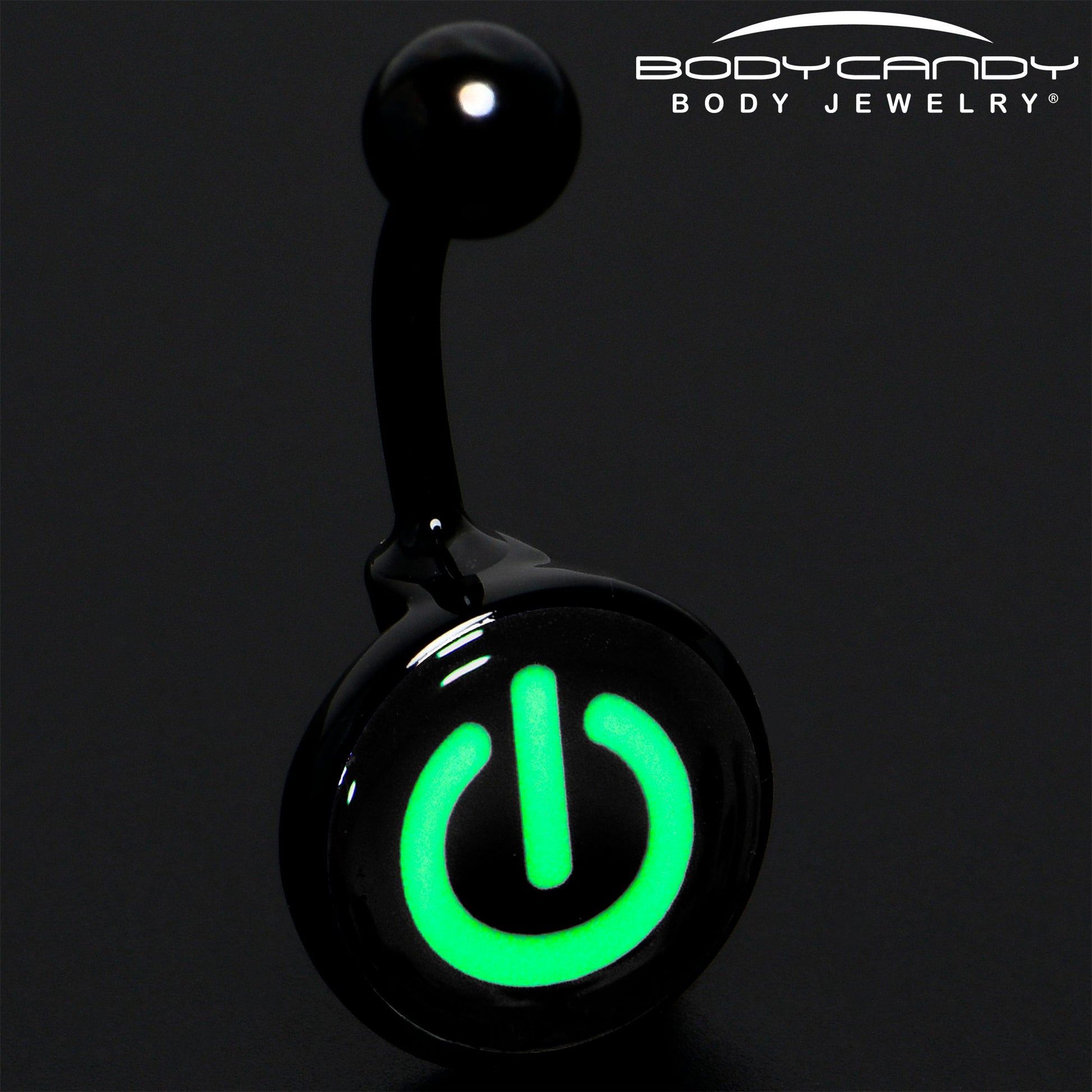 Power button belly button ring. Glow in the dark navel ring with a logo inlay. Anodized titanium over surgical steel curved barbell body jewelry with glowing style.