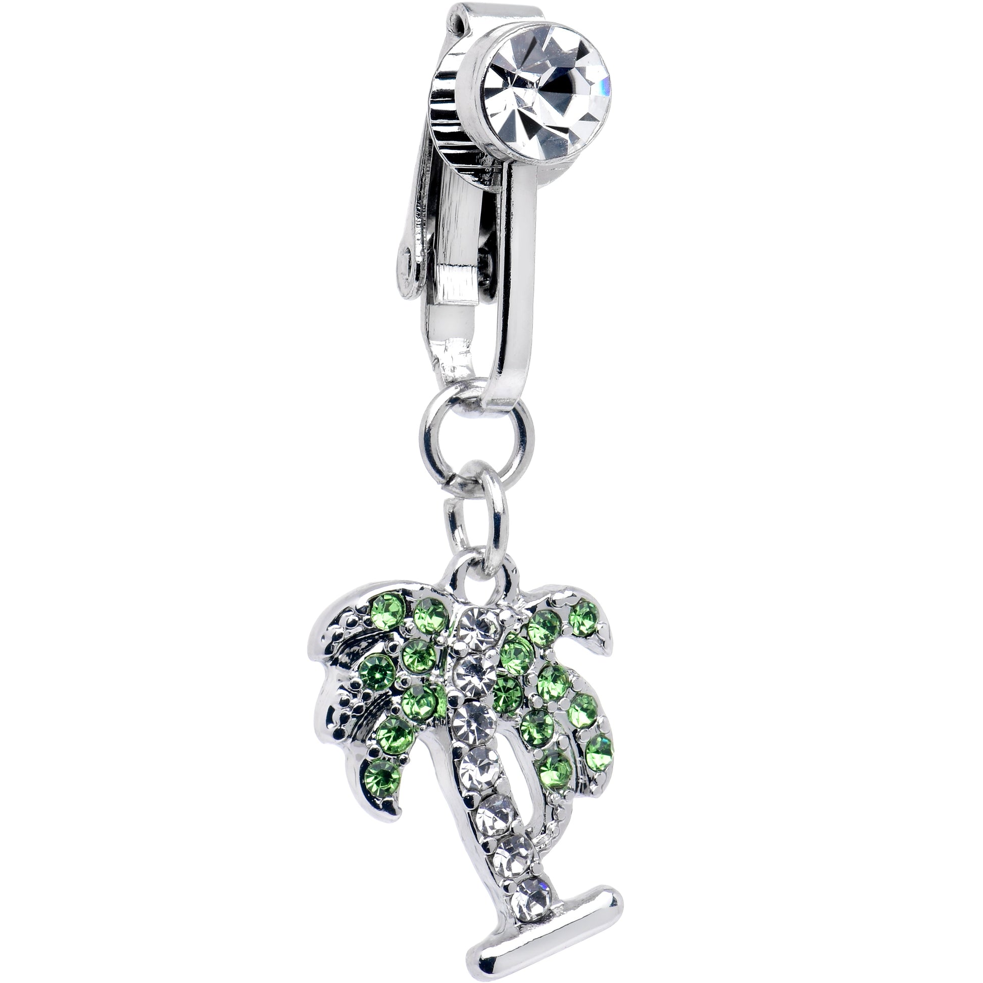 Green Clear CZ Gem Balmy Palm Tree Dangle Clip on Fake Belly Ring