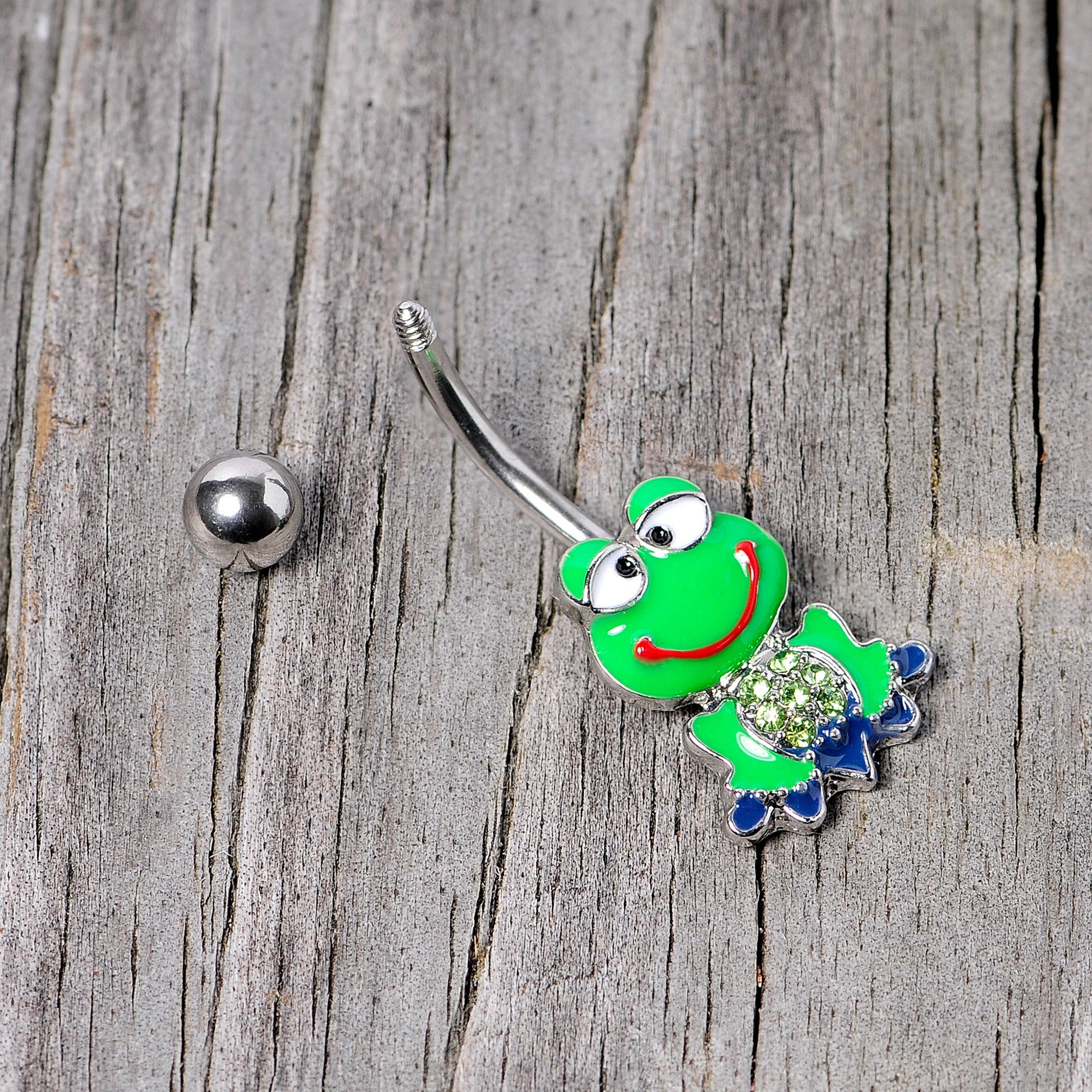 This frog is so happy to be in your navel piercing that he's absolutely goofy with glee! This 14 gauge navel ring is made with a 3/8" durable 316L surgical grade stainless steel curved barbell with a 5mm top ball end. The bottom end features a whimsical green frog charm with green gems. It's wearing a big silly smile and features black detailing on its toes for some extra color. Let this funny frog belly button ring add some capricious color to your belly piercing!Specifications